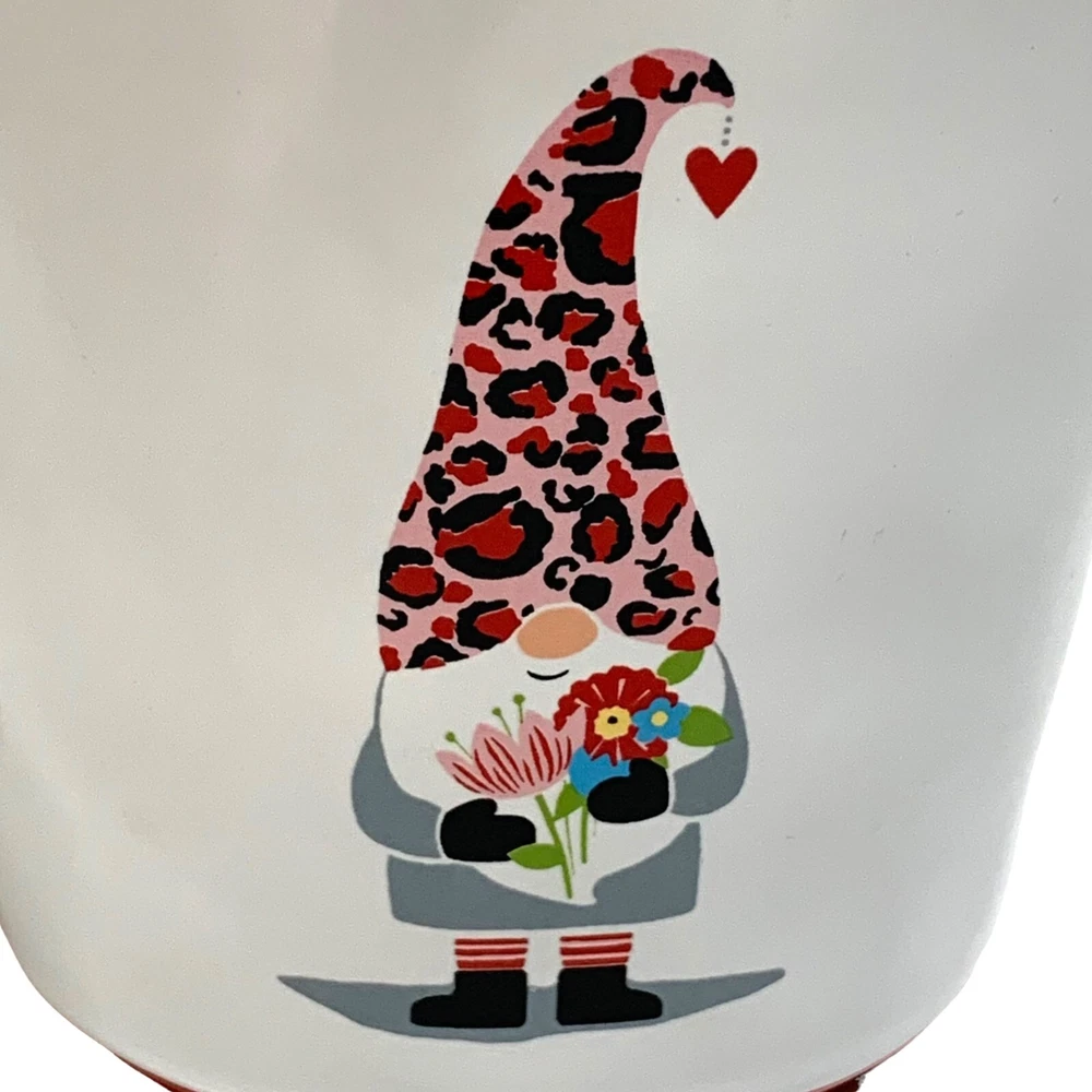 Prima Design Gnome Mug Valentine's Day Love Cup Pink Red Leopard Print Hat Heart Flowers This fabulous mug is decorated with a cute gnome wearing a pink and red leopard print hat and holding a bouquet of flowers. A small heart of the same pink and red leopard print sits just inside the top rim. Perfect for celebrating Valentine's Day or just adding a touch of whimsy to your morning coffee routine. Microwave and dishwasher safe. Measures approximately 4" tall x 4.25" diameter (top); 15 oz capacity.