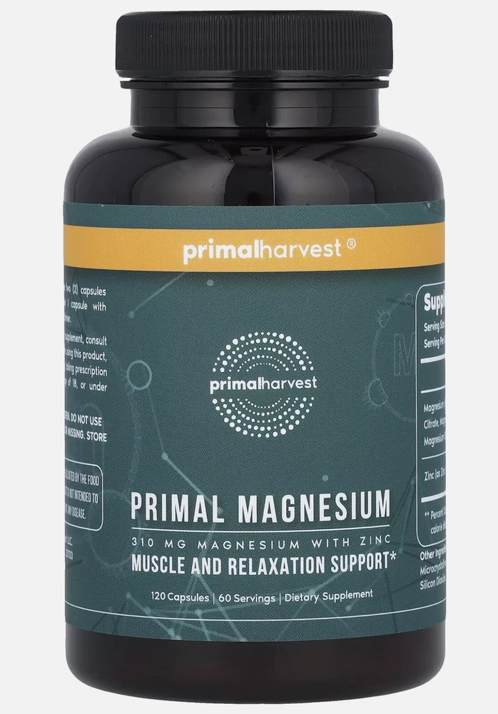 About this item Support Muscle Function and Boost Energy Levels: Magnesium helps maintain normal muscle function by helping to combat fatigue, cramps and spasms, while promoting cellular energy production, for overall vitality Bone Density & Strength: Magnesium plays a key role in regulating vitamins and nutrients like calcium and zinc to help strengthen bones and maintain bone density. Immune Booster: Primal Magnesium features 3 different types of magnesium plus 8mg of Zinc which can help to promote overall immune health while also helping to promote recovery after a workout Recommended Dosage: Take 2 capsule a day, with water, or as suggested by your health care professional, combine with balanced meals, exercise, water, and plenty of rest The Primal Harvest Promise: A 360 approach to wellness, all made in a GMP-certified facility and third-party tested, for ayurvedic and premium formulas that help support overall wellness