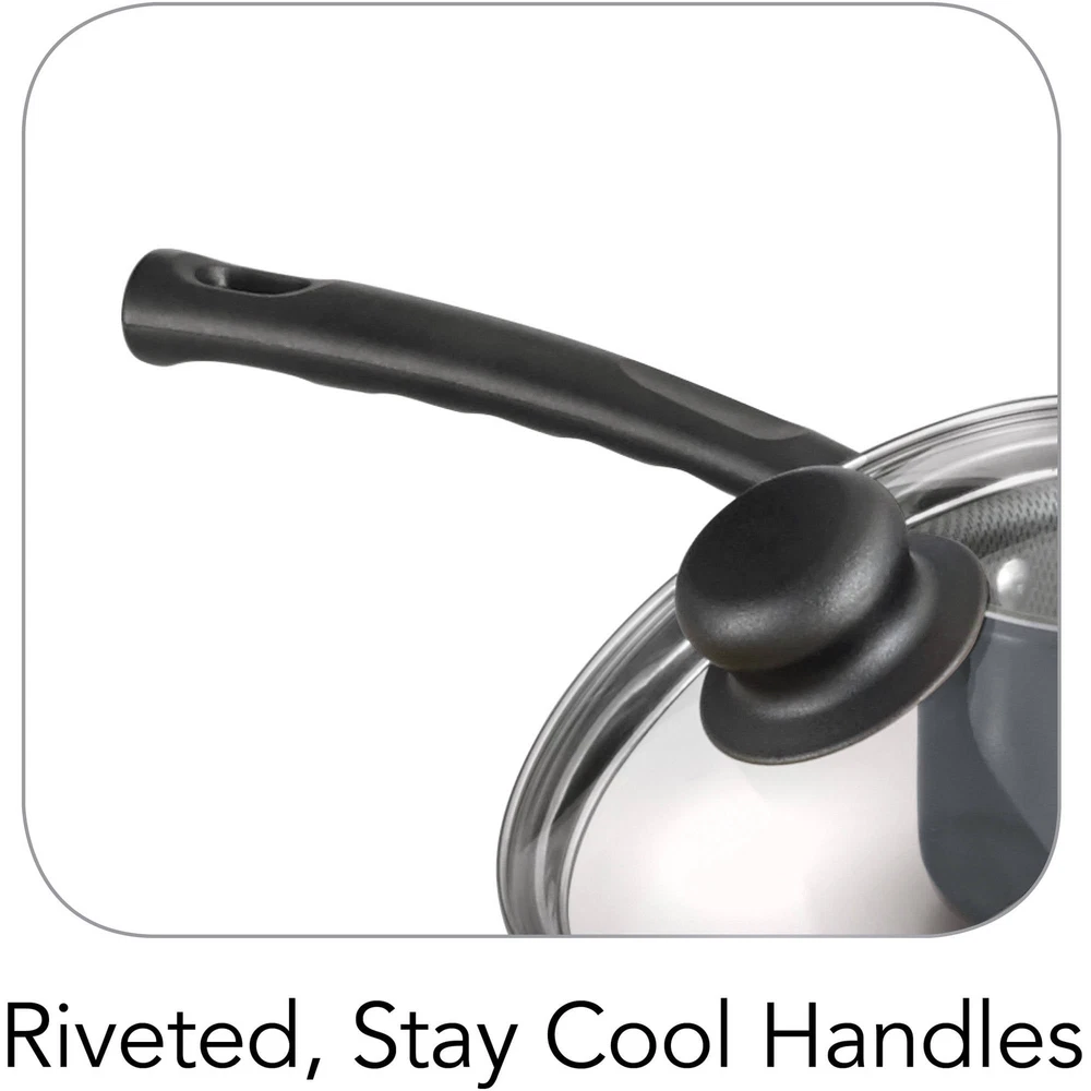 Prepare many memorable meals with this Tramontina Nonstick Cookware Set. It provides all the essentials for making soups, sauces, frying, and much more. The patterned interior coating on this Tramontina 10-piece cookware set ensures ease of use and simple cleanup. This 10-piece nonstick cookware set is fitted with riveted handles that stay cool. When done, everything can be placed in the dishwasher for your convenience. PrimaWare 10-Piece Nonstick Cookware Set, Steel Gray: Complete cookware set with patterned gray interior nonstick coating for easy cooking and cleaning Tramontina 10-piece cookware set has riveted, stay-cool handles Heat- and shatter-resistant tempered glass lids allow easy monitoring of cooking progress10-piece nonstick cookware set is dishwasher safe Compatible with gas, electric, and ceramic glass cooktops Set includes:8" saute pan9" deep saute pan1 qt saucepan with lid2 qt saucepan with lid3 qt saucepan with lid4 qt Dutch oven with lid (4 qt lid fits the 9" deep saute pan)Model# 80119/542
