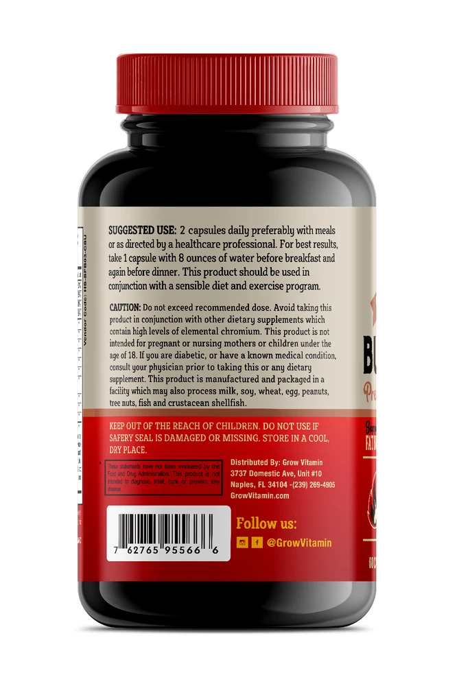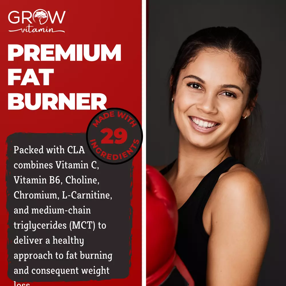 All-In-One Diet Pills for Men and Women, Grow Vitamin Fat Burner combines the most effective stimulant-free ingredients for fat burning and weight loss management; this full spectrum formula support the areas critical for effective weight loss including release of stored fat, fat burners, appetite support, metabolism support, and mood support. Real Results Stop settling for supplements that simply don't work. Made with premium ingredients, our one-of-a-kind fat burner helps you reach the mark. Feel a clean surge of energy, enhanced focus, and appetite control to help keep your diet in check. Grow Vitamin's Premium Fat Burner helps maximize fat burning while preserving hard-earned lean muscle. Maximize the Burn For best results, use for 60 days in combination with a healthy diet and exercise program. Drink plenty of water daily to avoid dehydration and never take Grow Vitamin's Premium Fat Burner on an empty stomach. Read instructions carefully. Research-Backed Ingredients Grow Vitamin's Premium Fat Burner uses premium natural ingredients, efficacious doses, total label transparency, and contains no artificial fillers, preservatives, or food dyes. Each bottle of Grow Vitamin's Premium Fat Burner is manufactured in a cGMP manufacturing facility in the USA, adhering to the most stringent manufacturing standards. TIPS Never take our Fat Buner on an empty stomach Drink plenty of water daily Avoid taking 5-6 hours before bed Combine with healthy eating and an exercise program Immediately discontinue use if you experience serious side effects or allergic reactions 11 Active Ingredients: 11 Modes of Action to help burn fat, boost metabolism, and curb appetite to help you achieve results around the clock without stimulants; Grow Vitamin’s 100% transparent formula of 11 powerful ingredients including Green Coffee, Green Tea, Raspberry Ketone, CLA, L-Theanine, and Garcinia Cambogia offer unique modes of actions to help burn fat and control your appetite morning and night. Metabolism Booster to Support Weight Loss Goals: this weight loss supplement formula contains Green Tea Extract which supports metabolic rate to help burn fat; this fat burning pills includes Green Coffee Bean Extract to support glucose metabolism through a high % of Chlorogenic Acid (CLA), an omega 6 essential fatty acid that supports metabolism by turning stored fat into energy; Grow Vitamin's Garcinia Cambogia supports energy production and metabolism helping you burn fat while you work out. Burn Fat but Maintain and Protect Muscle: Our Fat Burner contains 50mg of CLA to help support preserving your muscles against the catabolic effects of dieting and exercise; when on a low calorie diet, CLA supplementation before or during workouts could make a difference by targeting fat instead of muscle; with 50mg of L-Theanine, Fat Burner supports blood flow to the muscles, resulting in reduced oxidative stress which supports less muscle damage during and after a high-intensity workout. Non-Proprietary, Fully Disclosed Quality Ingredients: Unlike many brands with proprietary blends, Our Premium Fat Burner ingredient label is 100% transparent so you can see the exact amounts of every ingredient of our full spectrum formula; made in the USA with premium quality ingredients in a plant that is certified for Good Manufacturing Practices; our stimulant-free fat burner for men and women can be used by anyone from those just getting into fitness to competitive athletes.