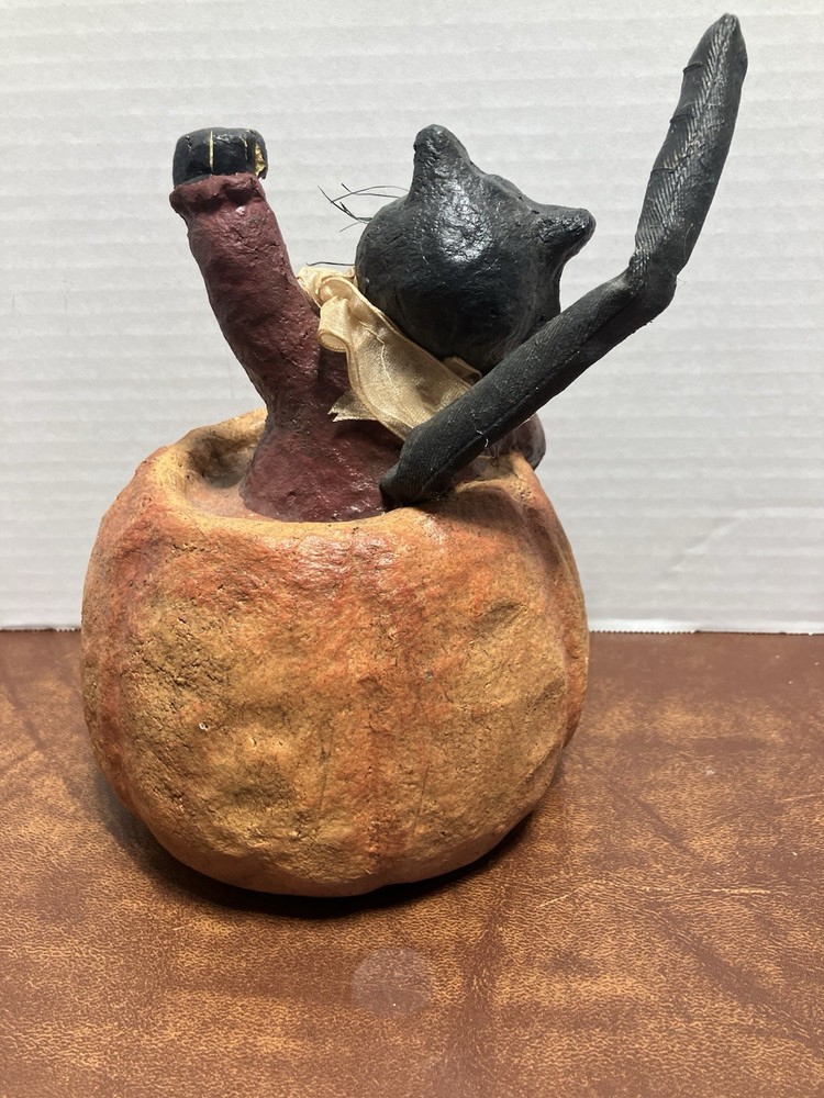Condition: Pre-owned (See detailed description). Material: Resin / Composite / Papier-mâché style Theme: Halloween, Fall, Primitive Type: Figurine Description: Add a touch of whimsical spookiness to your Halloween display with this charming primitive-style figurine. The piece features a black cat with wire whiskers and a ruffled fabric collar popping out of a textured Jack-o'-lantern. The pumpkin features unique "spiral" eyes and a grinning face. Key Features: Style: Primitive / Folk Art / Vintage Reproduction. Design: Distressed finish with "antique" styling. Details: Wire whiskers, cloth/crepe paper collar, and hand-painted details. Dimensions: Approximately 8 inches tall x 5 inches wide. Condition: Excellent pre-owned condition. The item has an intentionally distressed, rough texture to mimic vintage papier-mâché. Please see photos for exact condition and details.