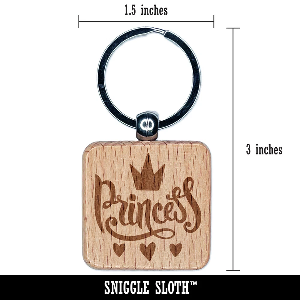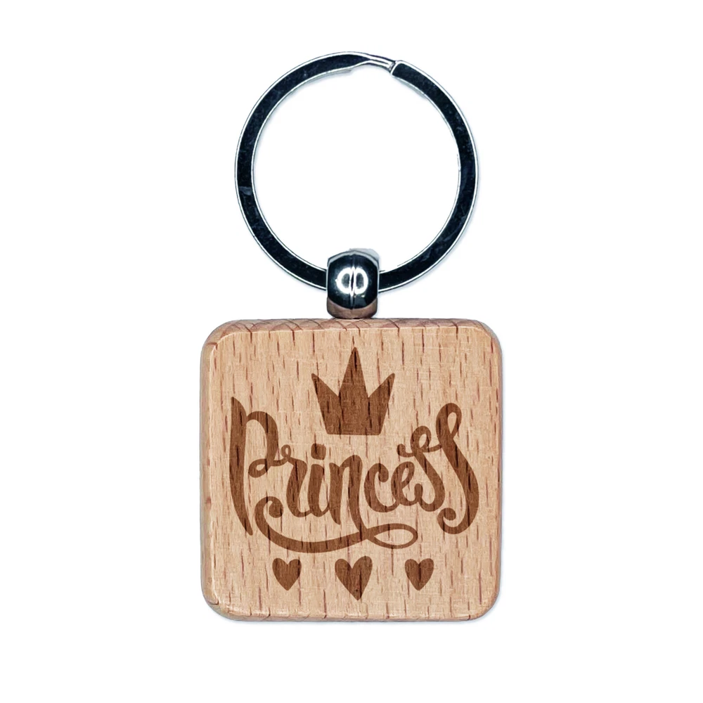 Princess Cursive with Crown and Hearts Engraved Wood Square Keychain Tag Charm