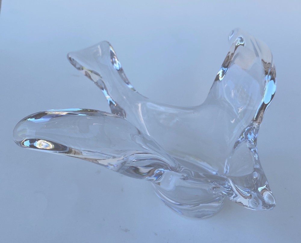 The Princess House art glass Bird dish Dove Bowl is a contemporary candy dish featuring a bird theme. Made of clear glass, this trinket vanity jewelry piece is designed in a sleek and modern style, perfect for adding a touch of elegance to any space. Produced by Princess House, known for their art glass creations, this dish is ideal for holding small trinkets or jewelry in a stylish manner.