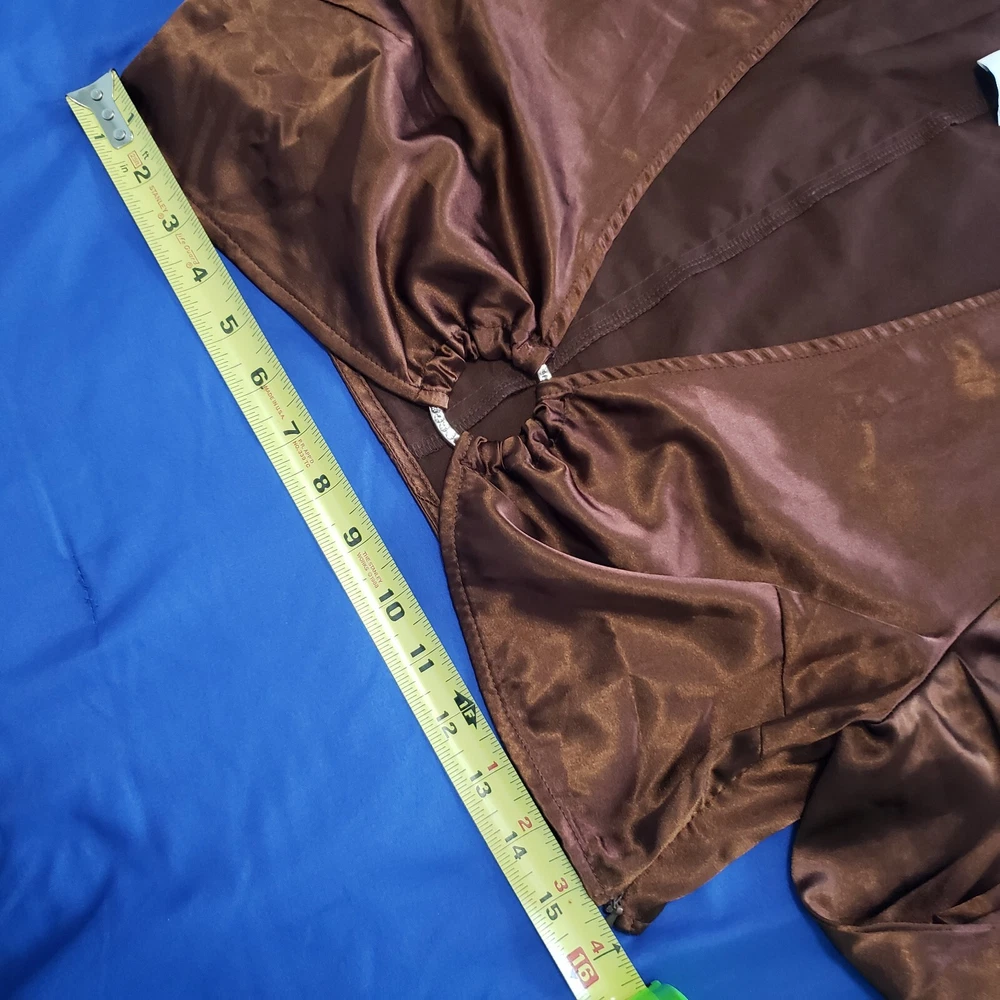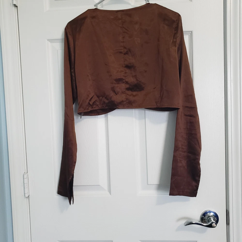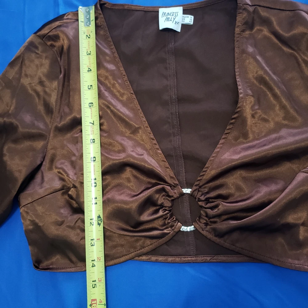 Princess Polly Brown Satin Cropped Top Size Large. Rhinestone studded center ring, long sleeve with slit at cuff. Side zipper close. Rich brown satin - photos against door are most representative of color. Great alone or over a bodycon top or dress. Boho Whimsigoth Fairygoth vibes. Excellent condition. Returns accepted - buyer pays return shipping.