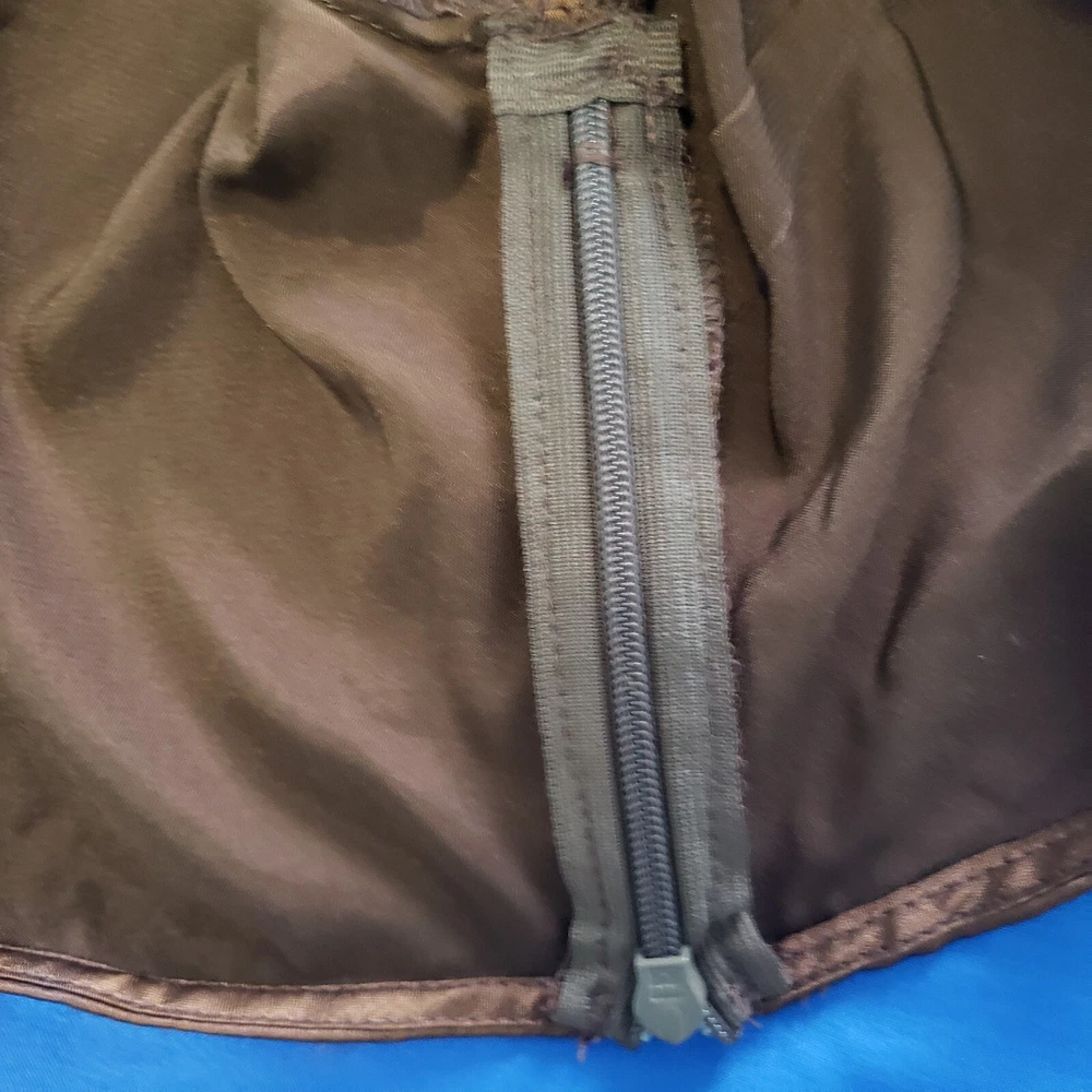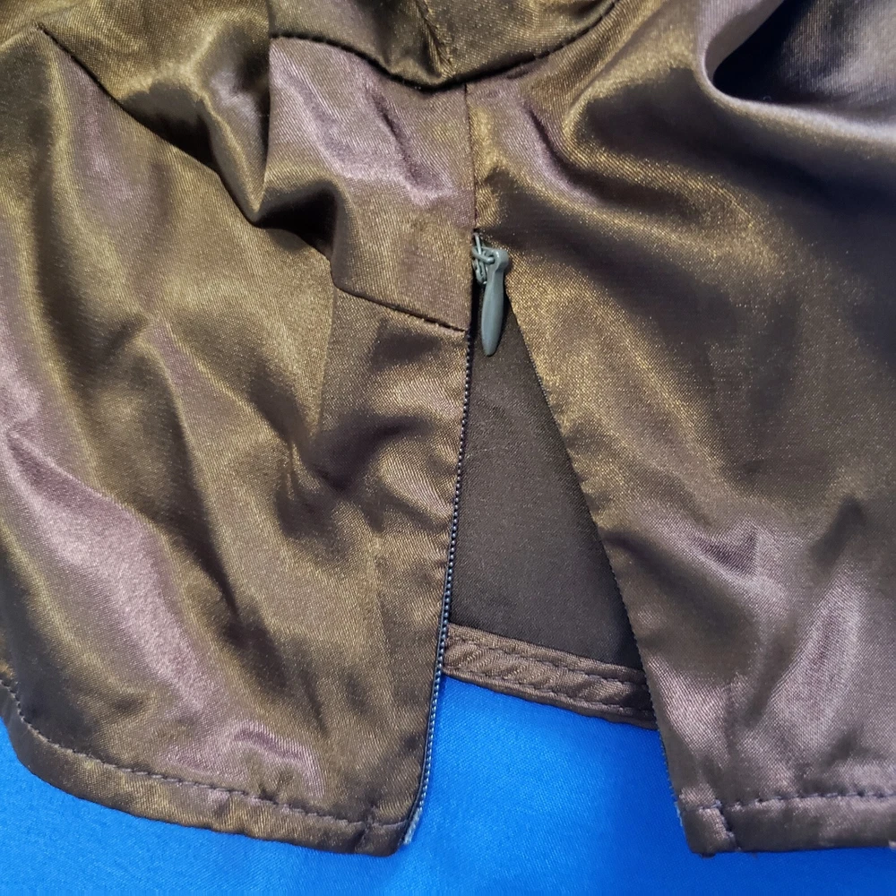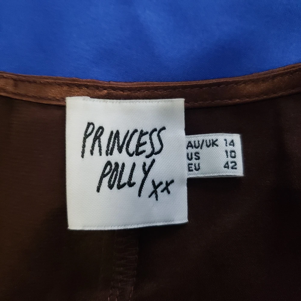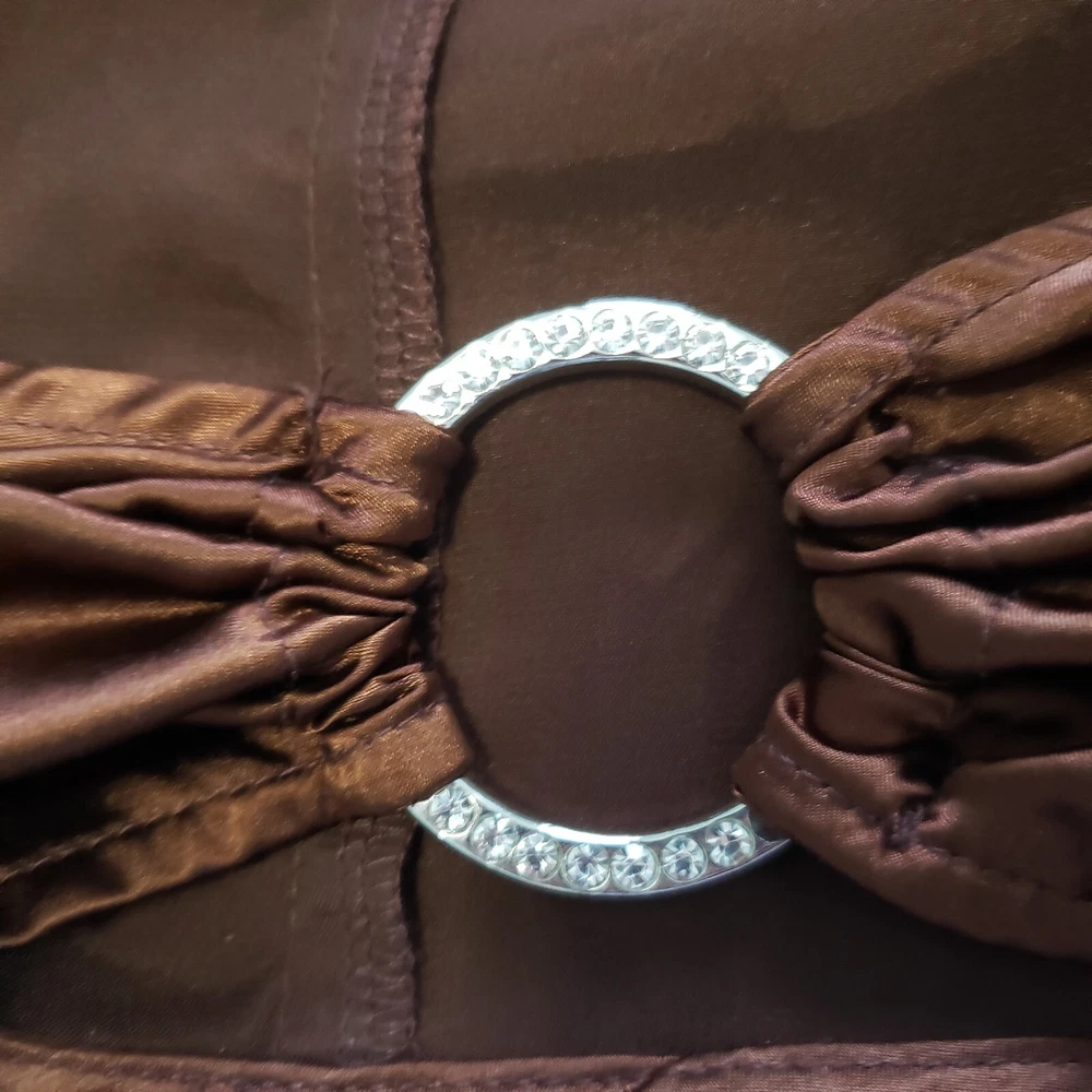 Princess Polly Brown Satin Cropped Top Size Large. Rhinestone studded center ring, long sleeve with slit at cuff. Side zipper close. Rich brown satin - photos against door are most representative of color. Great alone or over a bodycon top or dress. Boho Whimsigoth Fairygoth vibes. Excellent condition. Returns accepted - buyer pays return shipping.