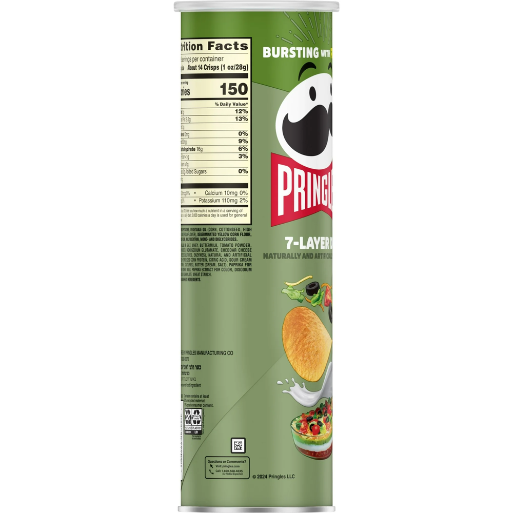 The Pringles 7-Layer Dip Potato Crisps Chips are a delicious lunch snack that comes in a convenient 5.5 oz canister. These American-style potato crisps are flavored with onion, cheddar, and sour cream, making for a tasty and satisfying snack. With 150 calories per serving and 6 servings in the canister, these chips are perfect for enjoying on-the-go or at home. Made in the United States and certified as Kosher, these chips are guaranteed to be fresh and delicious.13424472564