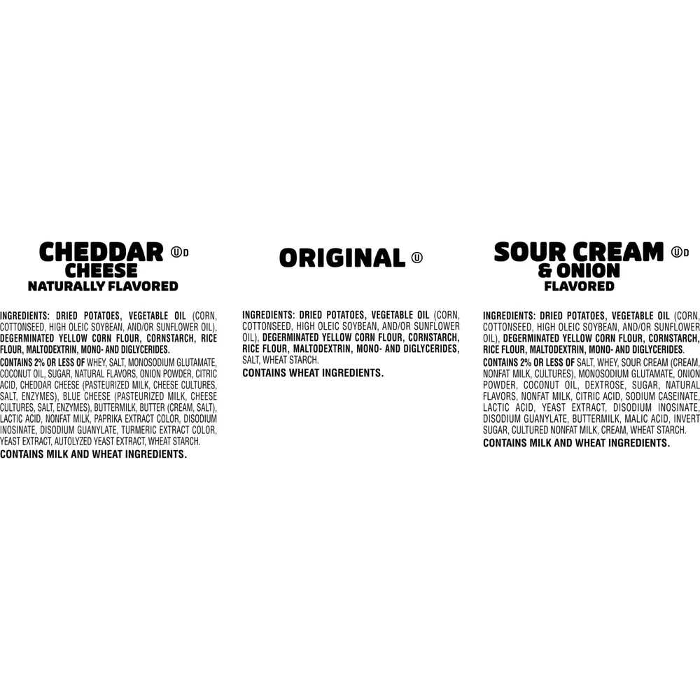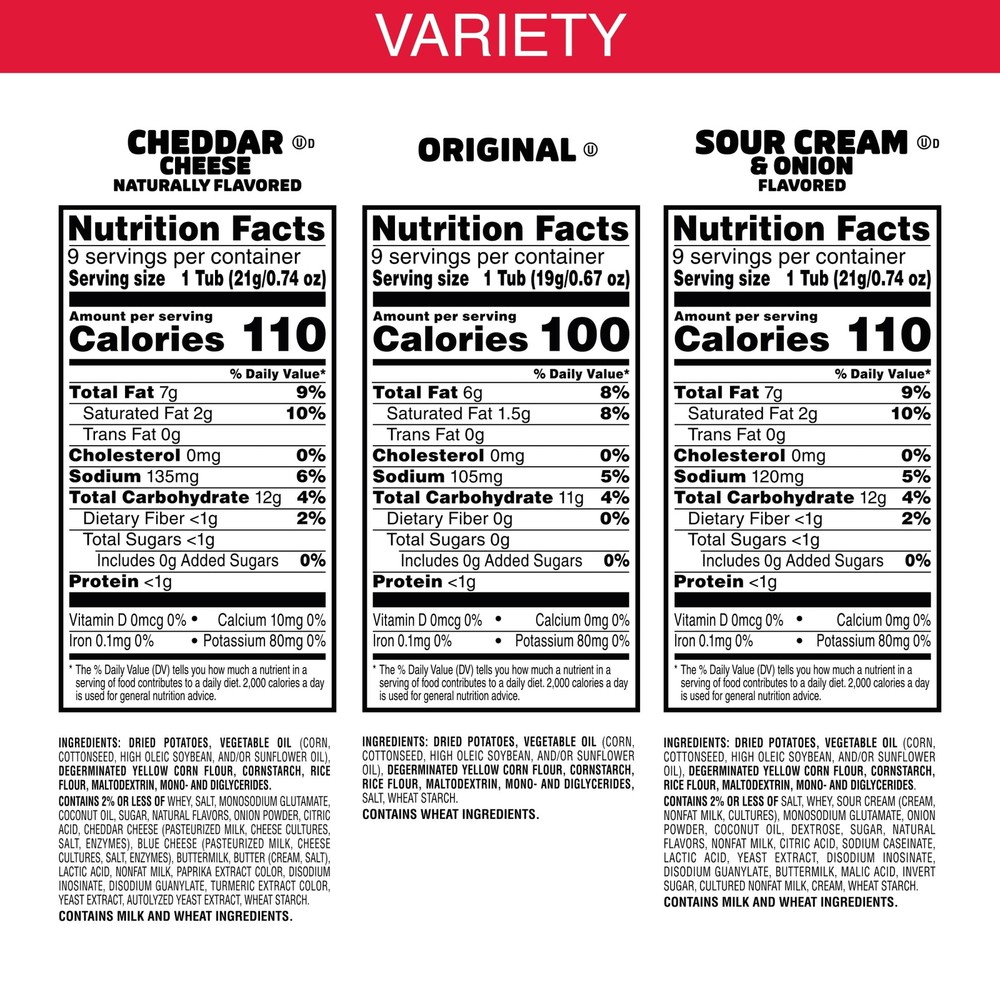 Enjoy a crispy, hearty, just-right potato taste in three delicious flavors. This assortment includes single-serve cups of original, cheddar cheese, and sour cream and onion chips. They're light, crispy, non-greasy, and full of salty flavor. These handy little cups are easy to take on the go. Create snack time on the go; grab one for an after-school pick-me-up or pack it for school lunches. Bring these portable snacks to game time and pack some for other Pringles fans. Keep this ready-to-go snack in your pantry or at your desk for a treat. Share this assortment at your next picnic or barbecue to add flavor and fun to your day with family and friends. Get your hands on Pringles and enjoy a tantalizing selection of flavors that will keep you coming back for more bite after bite. Pringles Assorted Potato Chips, Lunchtime Snack, 27-Count: Pringles Assorted Potato Chip Cups, Three Delicious Flavors: Cheddar, Original, and Sour Cream and Onion; Shelf-Stable Three flavors of stackable chips that are packed with mouthwatering goodness from rim to rim for a delicious treat. A delicious, non-greasy snack; Kosher certified; contains milk and wheat. Single-serve chip cups are perfect for school lunch boxes, backpacks, or tote bags; easy to take on the go. Contains one 19.3-ounce box with nine cups each of Sour Cream and Onion, Original, and Cheddar.