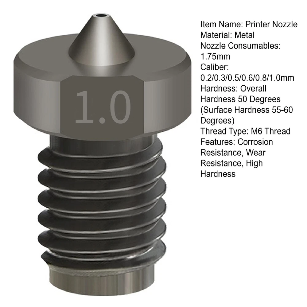 Other | | | | | | Printer Parts 1mm Printer Nozzle Hardness Printer Nozzle with Corrosion Wear < < < > > > < < < < < < < < < < > > > > > > > > > > Description: Are you looking to enhance your 3d printing experience? look no further than our high-quality printer nozzle for 3d printers! made from durable metal material, these nozzles are designed to withstand high temperatures and resist abrasion, ensuring long-lasting use. With smooth surfaces and precise apertures, they prevent leakage and allow for easy filament flow without clogging. Available in various output diameters, these nozzles are engraved with size for easy identification and replacement. Compatible with most 1. 75mm 3d printers on the market, our nozzles feature cutting and chamfering to reduce resistance and improve filament feeding. Made from high-quality hot-formed steel with carburizing and hardening treatment, they offer exceptional wear resistance, heat resistance, hardness, toughness, and a long service life. Upgrade your 3d printing experience with our reliable printer nozzle today! Item Name: Printer Nozzle Material: Metal Nozzle Consumables: 1.75mm Caliber: 0.2/0.3/0.5/0.6/0.8/1.0mm Hardness: Overall Hardness 50 Degrees (Surface Hardness 55-60 Degrees) Thread Type: M6 Thread Features: Corrosion Resistance, Wear Resistance, High Hardness Size Detail: Length: 12.5mm/0.49" (Approx.) Notes: Due to the light and screen setting difference, the item's color may be slightly different from the pictures. Please allow slight dimension difference due to different manual measurement. Package Includes: 1 x Printer Nozzle Payment Shipping Return Contact Us 1. We acceptPayPal,Credit card,Debit card,Apple Pay,Google Pay ect as payment. 2. Please be sure your shipping address is correct before make a payment. 1. We ship to your eBay or Paypal address. Please make sure your eBay and Paypal address is correct before you pay. 2. Items will be shipped within 1-7 business days when we received payment. 3. Delivery time depends on destination and other factors. 4. International buyers please note: a. Import duties, taxes and charges are not included in the item price or shipping charges. These charges are buyer's responsibility. We will try our best to reduce the risk of the custom duties. b. Please check with your country's customs office to determine what these additional costs will be prior to buying. 30 DAY RETURN POLICY Customer Satisfaction is our main goal, all items are quality checked prior to being listed and sent out. Please contact us prior to leaving any Negative Feedback and allow us to make things right! If you not satisfied with it please include the original packaging and return form & tracking number otherwise the return may take longer to process the refund. Once we have received the item and inspected it we will issue the refund or resend within 1-7 business days. Please contact us in time if any enquriy under any circumstances. We greatly appreciate your positive feedback and we'll do the same to you. We care about our valued customers, and will always try our best to help you, if you have any problems. Working time: GMT+8 / 9:00-18:30 in normal we will reply you in one working day.