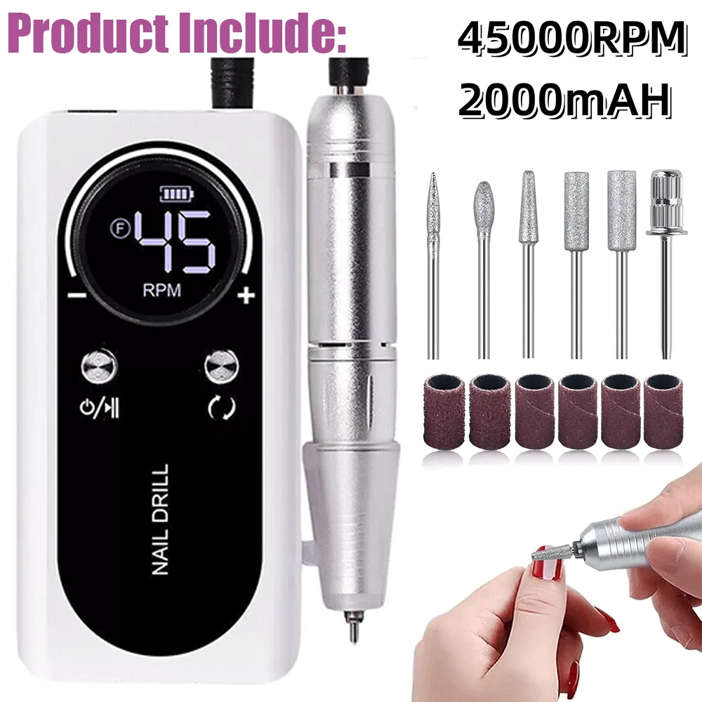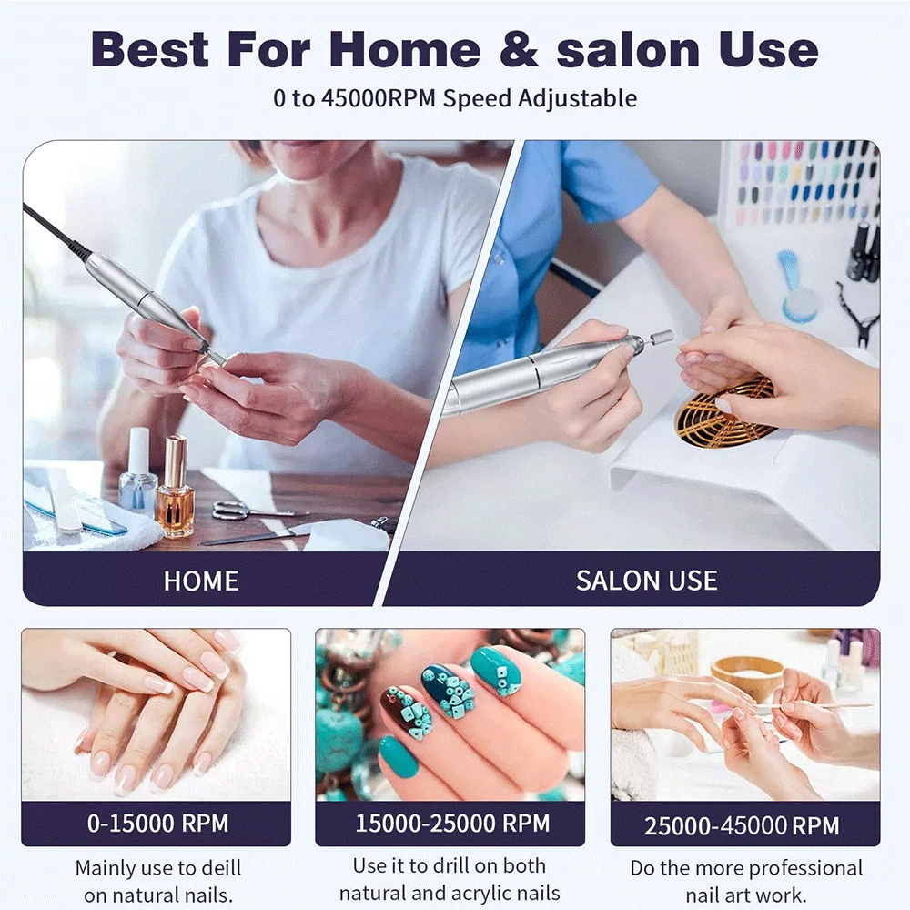Description • High Speed of 45000RPM : The nail drill machine has a high speed of 45000RPM, making it perfect for filing and sanding nails quickly and efficiently. • Rechargeable Battery : The nail drill machine comes with a rechargeable battery, eliminating the need for frequent charging and making it more convenient to use. • Portable Design : The nail drill machine has a portable design, making it easy to carry around and use on-the-go, perfect for travel or at-home use. • Compatible with Gel Nails : The nail drill machine is compatible with gel nails, allowing users to file and sand their nails with ease, achieving a professional look at home. Note: When the host is charging, the number on the display must be "00" to charge the host, and the grinding pen and the host cannot be charged at the same time (because there is a protection program to avoid damage to the host) Specifications: Variable Speed: 0 - 45000RPM(adjustable) Battery capacity: 2600 mAh Charging Time: 3 hours Working Time: Up to 10 hours Bits Size: 3/32 inches Nail Drill Machine Size: 5.7 x 2.75 x 1 inches Box Size: 9 x 7 x 2.2 inches Input Voltage Range: AC100-240V / 50-60Hz Advantages: This new sander has a detachable back armor and can be placed flat directly on the table, unlike previous sanders. 【 High Quality & Aesthetically 】 45000RPM Electric nail drill is made of high-quality materials, and it is very textured in the hand. The design of colorful makes the nail drill look more beautiful and more advanced. [Max Speed 45000RPM] Rechargeable nail drill matched with power bank, full charge 3 hours can work up to 10 hours, the speed can be adjusted at 0-45000RPM, easier and safer for beginners use, the max speed is up to 45000PRM with a speed control button, which is great for acrylic nails. 【 Low Heat/Noise/Vibration 】 Nail drills for acrylic nails professional was designed with a brushless motor, aluminum alloy body, high-quality bearing and cooling system inside, which has good heat dissipation, works smoothly and makes the electric file low heat, low noise, and low vibration. 【 LCD Smart Screen 】 The LCD smart screen can display speed, rotation direction and remaining power clearly, so you can operate based on your needs, the mini pen-sized electric nail file can be held and carried easily anywhere, with forward/reverse direction, this electric nail drill is convenient for both left and right-handed people. 【 Portable Size 】 With a portable belt clip design at the small size power bank, this nail drill machine is more lightweight to allow you to hang it on your waist loop easily, which will not make your hands feel tired after long-term use. The nail filer electric is compact enough to pack into your bag or luggage to enjoy the nail art DIY anytime anywhere. 【 Multifunctional 】 Professional nail drill is packed with 6 nail drill bits and 6pcs sanding bands, meet your different needs, the acrylic nail drill can be used for grinding, cutting, polishing, acrylic powder, carving, and removing gel nail, cuticles and dead skin without hurting hands and nails. with different kinds of nail drill bits, you can quickly choose the desired nail drill bit, easy to use.