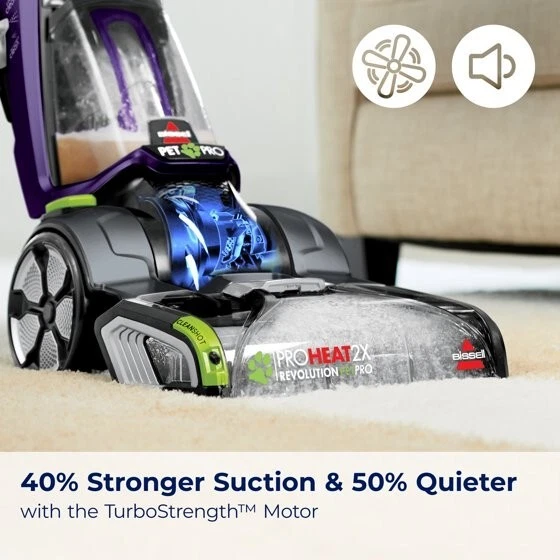 We know pets make messes. Whether it's tracked-in mud or bathroom accidents, BISSELL® ProHeat 2X® Revolution® Pet Pro Advanced Upright Carpet Cleaner is built to handle those messes — and more — with ease only weighing 18 lbs. This machine includes our energy efficient TurboStrength™ Motor Technology that delivers powerful suction and a quiet clean. Plus, with CleanShot® pretreater, you can penetrate tough spots and stains. Additionally, the ProHeat 2X® Revolution® Pet Pro Advanced carpet cleaner comes with 3 different cleaning modes: MAX Clean Mode to remove embedded dirt, stains and allergens, Deep Clean Mode for tough stains and spills, and Express Clean Mode to dry your carpets in about 30 minutes.* Heatwave Technology® helps maintain the water temperature throughout cleaning. Plus, each machine comes with an EZ 1PC Cleanup Removable Brush Roll Cover to make the clean up after the clean quick and easy. Each box comes with: the 2-in-1 Pet Upholstery Tool, a trial size of BISSELL® ADVANCED PET PRO OXY Urine Eliminator formula, and a trial size of BISSELL® Pet Stain & Odor + Antibacterial formula in fresh scents. All of this cleaning power comes in a lightweight and maneuverable machine with a low-profile foot that easily gets under furniture. But this machine doesn't just pick up after pets, it helps save them, too. BISSELL proudly supports BISSELL Pet Foundation® and its mission to help save homeless pets. When you buy a BISSELL® product, you help save pets. We’re proud to design products that help make pet messes, odors and pet homelessness disappear. *Express Clean Mode (reference instruction in user guide). Tested on new carpet with protectant. Results may vary. OUR BEST CARPET CLEANING SYSTEM.* Removes the toughest pet stains & odors — including skunk odors. TURBOSTRENGTH™ MOTOR TECHNOLOGY. Delivers 40% stronger suction and 50% more quiet with an energry efficient clean. ATTACKS TOUGH SPOTS & STAINS. The CleanShot® pretreater delivers a concentrated stream of cleaning solution right where you need it. 3 MODES OF CLEANING. MAX Clean Mode delivers professional grade cleaning to remove deep down embedded stains, dirt and odors while EXPRESS Clean Mode delivers dry carpets in about 30 minutes.* EZ CLEANUP BRUSH ROLL COVER. Easily clean the Dual DirtLifter® Power Brushes with the removable 1-piece brush roll cover. HEATWAVE TECHNOLOGY®. Helps maintain the water temperature during the clean. LIGHTWEIGHT DESIGN. Weighs less than 18 pounds with a Low-Profile Foot so it's easy to maneuver around furniture. 2-IN-1 PET UPHOLSTERY TOOL. Removes pet hair, stains and odors from upholstery and more. FORMULAS INCLUDED. BISSELL® Pet Stain & Odor + ANTIBACTERIAL Formula eliminates more than 90% of odor-causing bacteria and BISSELL® ADVANCED PET PRO OXY Urine Eliminator removes tough stains with the power of OXY. Keep your carpets looking and smelling clean and fresh. EVERY PURCHASE SAVES PETS™. BISSELL proudly supports BISSELL Pet Foundation® and its mission to help save homeless pets. *Express Clean Mode (reference instruction in user guide). Tested on new carpet with protectant. Results may vary. *Stain and odor removal system includes ADVANCED PET PRO OXY Urine Eliminator formula, 2-in-1 upholstery tool, CleanShot® Pretreater, EZ Clean Brush Roll Cover.