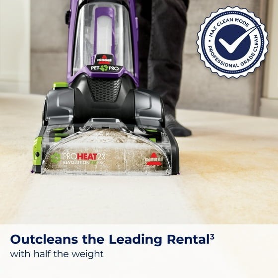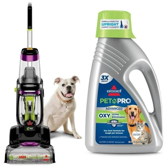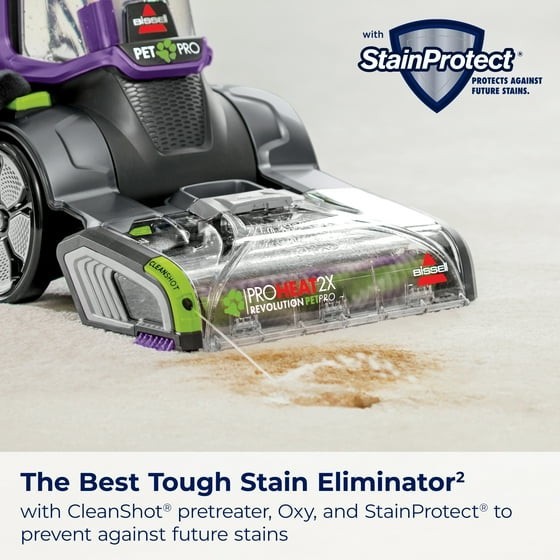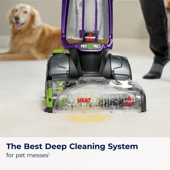 We know pets make messes. Whether it's tracked-in mud or bathroom accidents, BISSELL® ProHeat 2X® Revolution® Pet Pro Advanced Upright Carpet Cleaner is built to handle those messes — and more — with ease only weighing 18 lbs. This machine includes our energy efficient TurboStrength™ Motor Technology that delivers powerful suction and a quiet clean. Plus, with CleanShot® pretreater, you can penetrate tough spots and stains. Additionally, the ProHeat 2X® Revolution® Pet Pro Advanced carpet cleaner comes with 3 different cleaning modes: MAX Clean Mode to remove embedded dirt, stains and allergens, Deep Clean Mode for tough stains and spills, and Express Clean Mode to dry your carpets in about 30 minutes.* Heatwave Technology® helps maintain the water temperature throughout cleaning. Plus, each machine comes with an EZ 1PC Cleanup Removable Brush Roll Cover to make the clean up after the clean quick and easy. Each box comes with: the 2-in-1 Pet Upholstery Tool, a trial size of BISSELL® ADVANCED PET PRO OXY Urine Eliminator formula, and a trial size of BISSELL® Pet Stain & Odor + Antibacterial formula in fresh scents. All of this cleaning power comes in a lightweight and maneuverable machine with a low-profile foot that easily gets under furniture. But this machine doesn't just pick up after pets, it helps save them, too. BISSELL proudly supports BISSELL Pet Foundation® and its mission to help save homeless pets. When you buy a BISSELL® product, you help save pets. We’re proud to design products that help make pet messes, odors and pet homelessness disappear. *Express Clean Mode (reference instruction in user guide). Tested on new carpet with protectant. Results may vary. OUR BEST CARPET CLEANING SYSTEM.* Removes the toughest pet stains & odors — including skunk odors. TURBOSTRENGTH™ MOTOR TECHNOLOGY. Delivers 40% stronger suction and 50% more quiet with an energry efficient clean. ATTACKS TOUGH SPOTS & STAINS. The CleanShot® pretreater delivers a concentrated stream of cleaning solution right where you need it. 3 MODES OF CLEANING. MAX Clean Mode delivers professional grade cleaning to remove deep down embedded stains, dirt and odors while EXPRESS Clean Mode delivers dry carpets in about 30 minutes.* EZ CLEANUP BRUSH ROLL COVER. Easily clean the Dual DirtLifter® Power Brushes with the removable 1-piece brush roll cover. HEATWAVE TECHNOLOGY®. Helps maintain the water temperature during the clean. LIGHTWEIGHT DESIGN. Weighs less than 18 pounds with a Low-Profile Foot so it's easy to maneuver around furniture. 2-IN-1 PET UPHOLSTERY TOOL. Removes pet hair, stains and odors from upholstery and more. FORMULAS INCLUDED. BISSELL® Pet Stain & Odor + ANTIBACTERIAL Formula eliminates more than 90% of odor-causing bacteria and BISSELL® ADVANCED PET PRO OXY Urine Eliminator removes tough stains with the power of OXY. Keep your carpets looking and smelling clean and fresh. EVERY PURCHASE SAVES PETS™. BISSELL proudly supports BISSELL Pet Foundation® and its mission to help save homeless pets. *Express Clean Mode (reference instruction in user guide). Tested on new carpet with protectant. Results may vary. *Stain and odor removal system includes ADVANCED PET PRO OXY Urine Eliminator formula, 2-in-1 upholstery tool, CleanShot® Pretreater, EZ Clean Brush Roll Cover.