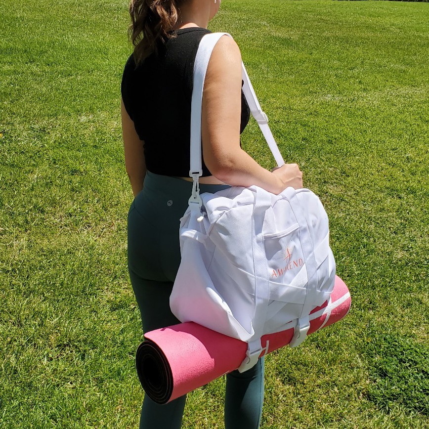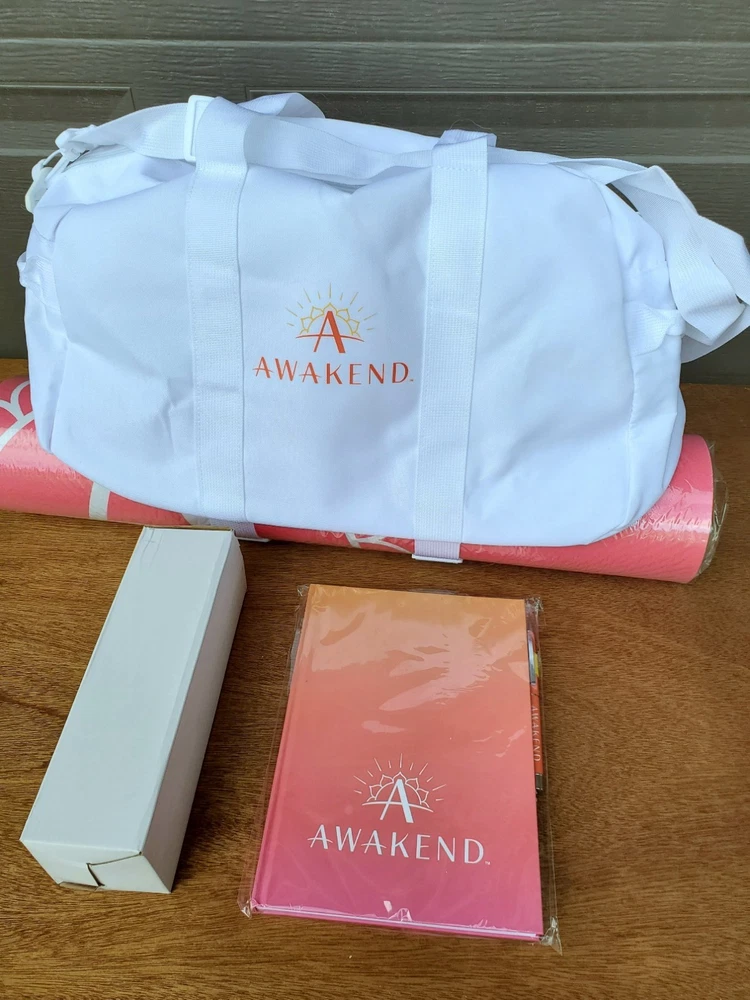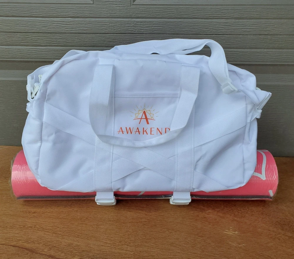 All items are NEW and branded with “Awakened”. This is a professional yoga mat, not the cheapfoam mats purchased at big box stores. The mat measures 68” long x 24” wide and the surface has a softmicrofiber texture. The duffle baghas a large zip opening and offers easy access to items while adjustable strapshold the yoga mat in place. Bag dimensions: 19” long x 8” wide x 13” tall.Strap length when fully extended: 50” Volume: 40L. Carry it by the handles oracross the body with the detachable strap. Interior pocket for your small itemsor cell phone. Also includedis a 20oz glass water bottle covered in a silicone wrap and a bamboo top.Bottle measures 9.5” tall. The journal measures 7” wide x 10” tall and comeswith a pen.