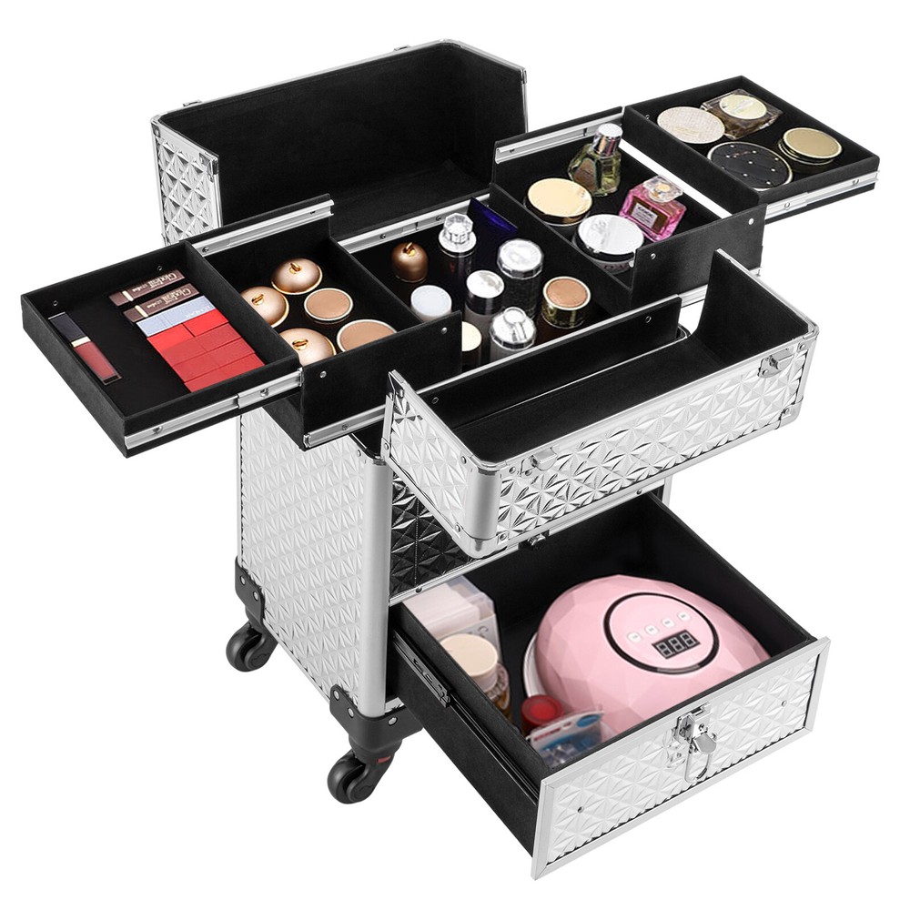 This makeup train case is a game-changer! The sturdy aluminum alloy frame and smooth-rolling wheels make it super portable, while the multiple compartments keep everything organized. The three-tier pull rod adjusts easily, and the spacious drawers hold all my essentials without clutter. Perfect for pros or anyone who loves a tidy beauty setup—durable, sleek, and surprisingly lightweight for its size!