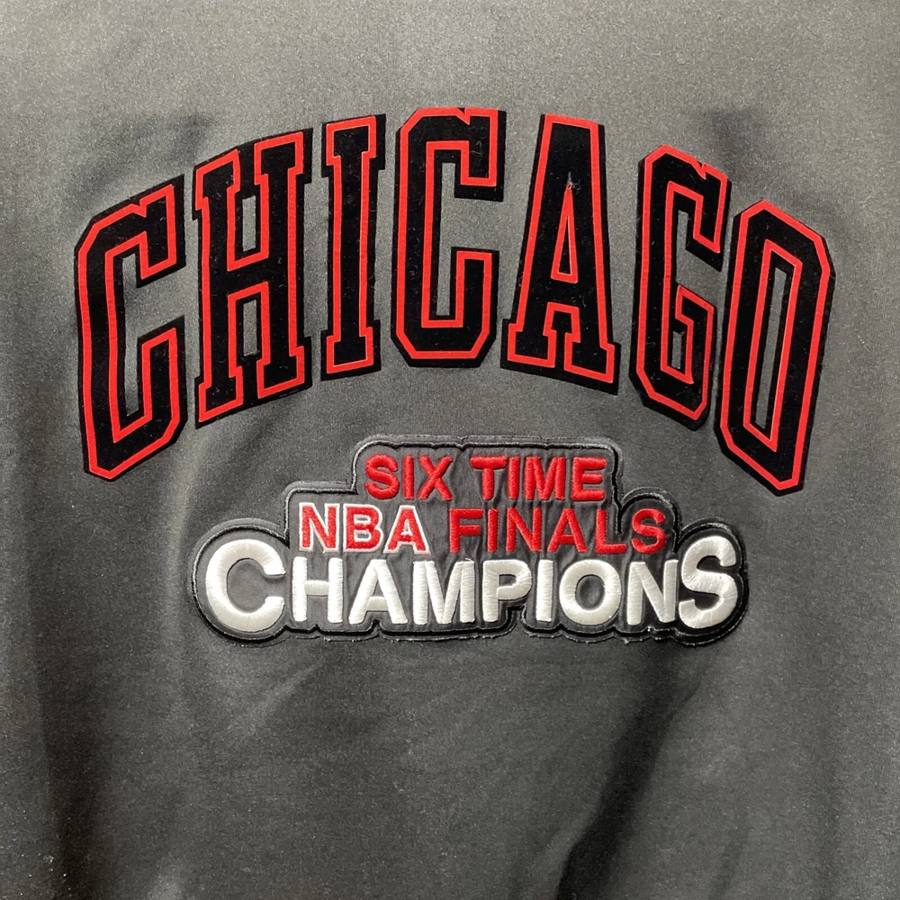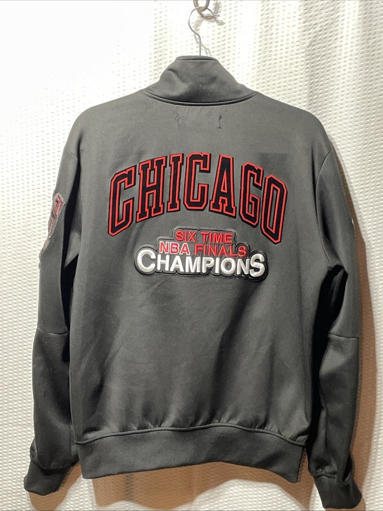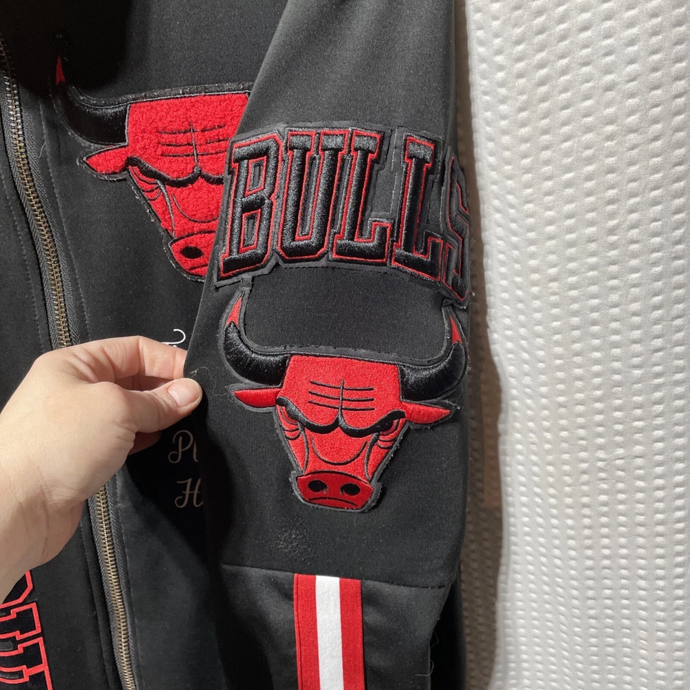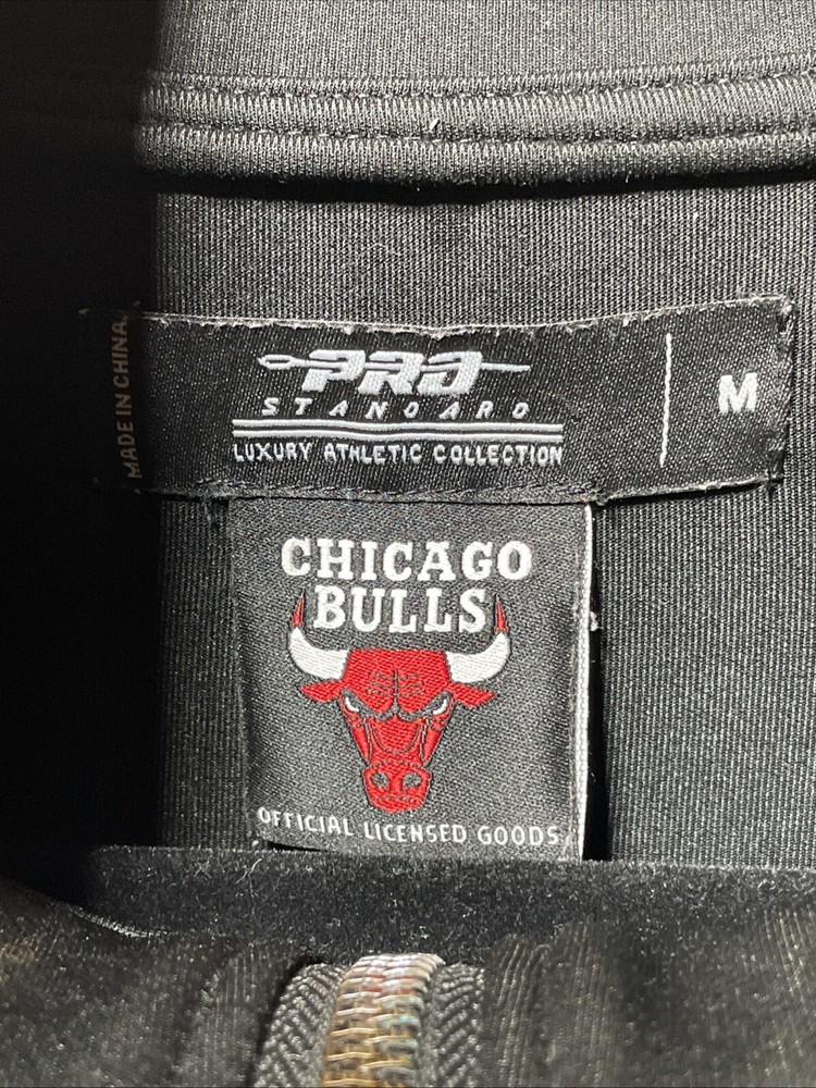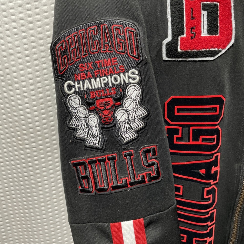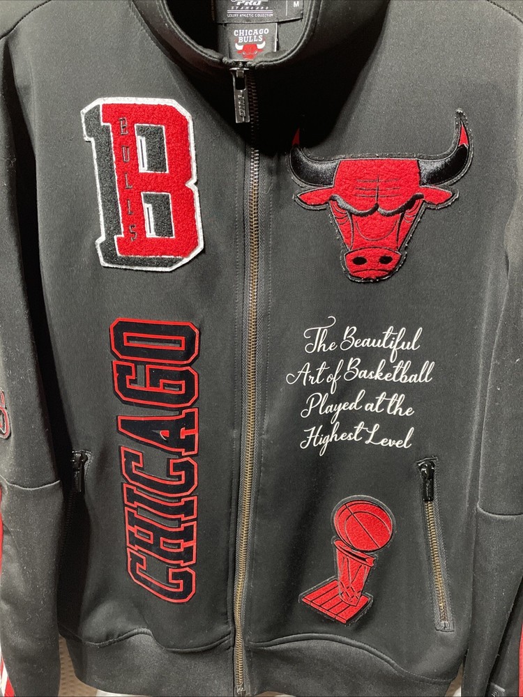 The Pro Standard Luxury Athletic Collection Chicago Bulls Full Zip Letterman Jacket is an officially licensed NBA apparel featuring the iconic Chicago Bulls team. Made in China, this unisex adult jacket is part of a luxury athletic collection and is designed with a full zip closure, showcasing the team's logo and colors. It is adorned with a letterman style, paying tribute to the NBA Finals and the legendary player Michael Jordan. The jacket, in size L, is a premium fan apparel piece that merges style and sportsmanship for basketball enthusiasts.