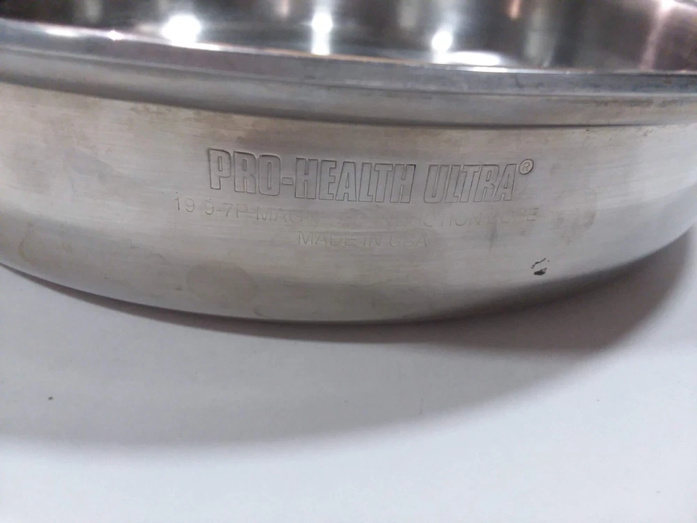Pro Health Ultra 19-9-7P magnetic induction core made in USA. Very Good See all photos. Handles removed to inspect and better facilitate shipping. Reattaching is easy. Handles very much like those on the Saladmaster Cookware I've listed.