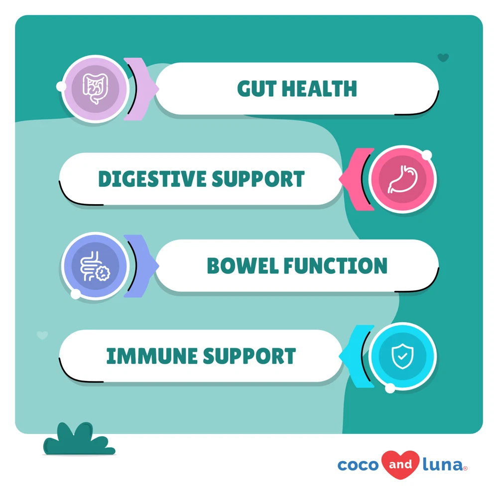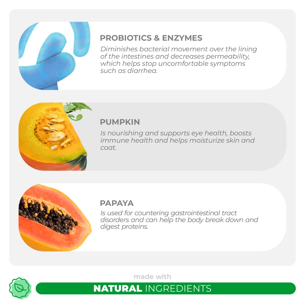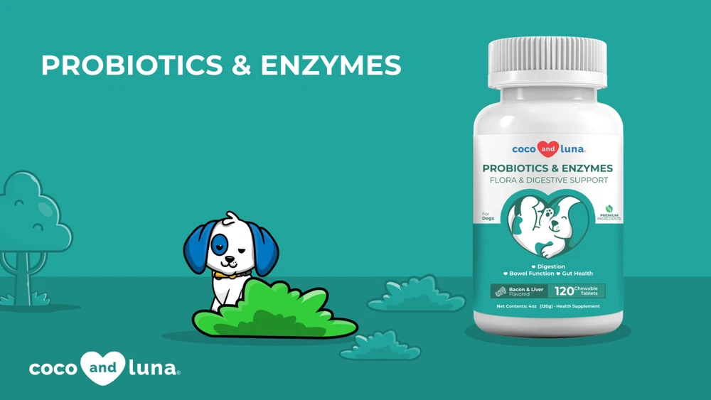Reduces bacterial movement over the lining of the intestines and decreases permeability, helping stop uncomfortable symptoms such as diarrhea. Contains digestive enzymes and probiotics that support digestive health, helping to reduce heartburn, constipation, bloating, and gas. Offers comprehensive digestive care, from the breaking down of fats, proteins and carbohydrates, to the population and support of a healthy microflora. Pumpkin is nutrient rich and supports eye health. Boost overall immune health. Moisturize skin and coat, leaving your dog's fur healthy and shiny. Pumpkins encourage digestive regularity. Papaya is a good source of fiber and helps with digestion. Papaya is used for preventing and treating gastrointestinal tract disorders, intestinal parasite infections and diuretic. The enzyme papain in papaya can help the body break down and digest proteins. Probiotic for Dogs- Coco and Luna Probiotics and Enzymes chewable tablets support healthy digestion, boosts the immune system and aids in nutrient absorption. Aids Digestion - Our dog probiotic chews contains digestive enzymes which promote a healthy stomach and assists in leveling the microflora of your dog’s intestinal tract which reduces bacterial movement in the intestines. Powerful Formula - Our safe and natural formula contains pumpkin and papaya which may boost the immune system and aid in digestion, as well as supporting eye health and being a great source of fiber. A Brand You Can Trust - We understand how much your pet’s health and wellbeing mean to you, so our supplements are manufactured in FDA-registered facilities that are NSF and GMP-certified in the USA. Made in the USA from US and Globally Sourced Ingredients - All our products are made in the USA and are veterinarian approved as well as hypoallergenic. Our pet probiotics for dogs can help aid with digestion and overall gut health for your pet.