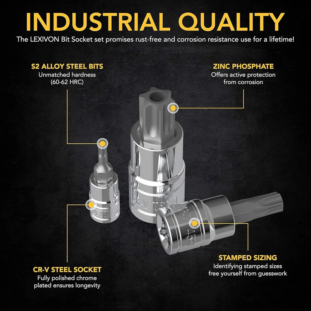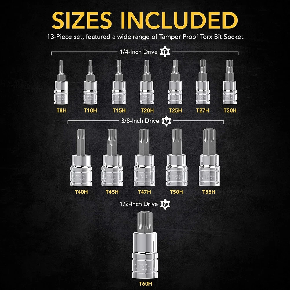 Tamper Proof Torx Bit Socket Set - S2 Steel, 13-Piece for Professionals ‹ › ‹ › ‹ › ‹ › ‹ › ‹ › ‹ › ‹ › ‹ › Tamper Proof Torx Bit Socket Set - S2 Steel, 13-Piece for Professionals Discover the ultimate in precision and durability with our 13-Piece Tamper Proof Torx Bit Socket Set, crafted for both the discerning DIY-ers and seasoned professionals. Why Choose Our Tamper Proof Torx Bit Socket Set? Construction: Each bit is expertly crafted with superior materials, designed for increased torque and unmatched hardness. Unmatched Durability: The drop-forged, heat-treated S2 alloy steel bits are built to reduce wear-outs, while the hardened chrome vanadium steel sockets enhance turning power. Longevity Assured: Our sockets feature a fully polished, chrome-plated mirror finish for complete rust and corrosion resistance, ensuring they stand the of time. User-Friendly Design: Experience smooth insertion with precision chamfered bit ends. Each size is conveniently stamped on the sockets and the heavy-duty storage case for quick recognition. Risk-Free Satisfaction: Meeting and exceeding ANSI standards, we back our set with a Lifetime Limited for your complete peace of mind. What’s Included: 13-Piece Tamper Resistant Torx Bit Socket - 1/4” Drive: T8H, T10H, T15H, T20H, T25H, T27H, T30H 3/8” Drive: T40H, T45H, T47H, T50H, T55H 1/2” Drive: T60H Storage & Carry Case (stamped bits sizes for easier recognition) Elevate Your Toolkit The Tamper Proof Torx Bit Socket Set is not just a toolset; it's an investment in quality and reliability, perfect for a wide range of applications from bikes to automobiles, appliances, lawn equipment, and beyond. With every bit crafted using CNC technology and designed with chamfered edges, rest assured your fasteners and tools are in safe, capable hands. Don't wait—empower your projects with confidence and precision. Click ‘Add To Cart’ now and experience the difference for yourself! Shipping Free & Fast Shipping - We offer free shipping to most of the USA with a normal delivery time of 3-7 days. However, due to the current situation, additional delivery time (up to 3 weeks) may be required for some items. Alternative Carriers - We may use alternative carriers (e.g. USPS, FedEx, UPS, etc.) to ensure your package arrives safely and on time. Due to the use of multiple carriers, we are unable to provide a tracking number automatically. Handling Time - Orders are processed and shipped within 1-2 business days of receiving cleared payment. Shipping Restrictions - Shipping to Alaska, Hawaii, Puerto Rico, Guam, and other US territories may incur shipping charges or delivery restrictions. Please contact us before ordering, or your order can be refunded/cancelled. State Restrictions - There may be restrictions based on your state of purchase. For example, certain items may not be shipped to California due to state regulations. Contact for Tracking Updates - If you require tracking updates or have any concerns about the delivery of your order, please feel free to contact us, and we will be happy to assist you. Return 30-Day Hassle-Free Returns - We want you to be completely satisfied with your purchase. If you are not, you can return the item within 30 days of receiving it for a full refund or exchange. Easy Return Process - To start a return, simply contact us and we will provide you with a prepaid return shipping label and detailed instructions. Restocking Fee - There are no restocking fees for returns. However, the buyer is responsible for return shipping costs if the return is not due to a seller's error. Refund Processing Time - Refunds will be processed within 5 business days of receiving the returned item in its condition. Payment We accept all major credit cards, PayPal, and Apple Pay for your convenience. Your payment information is secure and encrypted to ensure a safe and seamless transaction. Please complete your payment within 3 days of purchase to avoid any delays in shipping. Feedback Your feedback is extremely important to us. We strive to provide the best products and customer service possible. If you are satisfied with your purchase, please take a moment to leave us a positive review. If you have any concerns or issues with your order, please contact us before leaving negative feedback. We are committed to resolving any problems and ensuring your satisfaction. Contact Us If you have any questions or concerns, please feel free to out to our customer support team. You can contact us through the eBay messaging system. We are available Monday to Friday, 9:00 am to 5:00 pm EST, and we will do our best to respond to your inquiry within 24 hours. Buy it now and enjoy a pleasant shopping experience! Manufacturer Part Number: Torx Bit Socket Set Unit Quantity: 1.46 Tools Included: Sockets System of Measurement: Specialty Size: T8H - T60H,T8H,T10H,T15H,T20H,T25H,T27H,T30H,T40H,T45H,T47H,T50H,T55H,T60H Socket Type: Standard Drive Type: Star Drive Size: 1/4in. Surface Finish: Chrome Number of Pieces: 13 Unit Type: lb