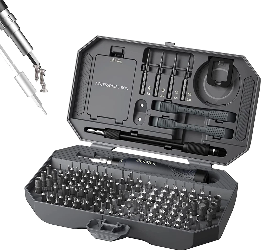 Store New Arrivals Add to Favorite View Feedback Contact Precision Screwdriver Set, Laptop Screwdriver Kit, JAKEMY 164 in 1 Professional Computer Screwdriver Repair Kit with T6 Torx Screwdriver for Macbook, Iphone, Watch, Camera, Eyeglass, Xbox, DIY Description Item model number YF-FO-164 Style Precision Screwdriver Repair Kit Number of Items 164 Power Source Hand Powered Country of Origin China Warranty Description Manufacturer Warranty for 365 Days from Date of Purchase, Our Brand After-sales Team Can Solve Any Problem for You. Batteries Included? No Head Size Standard bit sizes (e.g. H1.0, H1.5, H2.0, etc.) Usage Compact Screwdriver Repair Tool Batteries Required? No Finish Phosphating and Chrome-nickel Plating Brand JAKEMY Material CR-V Bit & ABS Case Model Name FO164 Included Components Phillips Screwdriver Set 1.0-4.0, Star Screwdriver Set 0.8-2.0, Hex Screwdriver Set 0.7-6.0, Other Multi Special Bits, Length Adjustable Handle, Slotted Screwdriver Set 1.0-4.0, Socket Screwdriver Set 2.5-5.5, ESD Tweezers, Soft Extension Shaft, Opening Tool Kit, ABS Case, Torx Screwdriver Set T1-T20 Item dimensions L x W x H 7.32 x 4.65 x 1.77 inches Item Weight 1.5 pounds Head Style function(f) {var _np=(window.P._namespace("DetailPageProductOverviewTemplatesJava"));if(_np.guardFatal){_np.guardFatal(f)(_np);}else{f(_np);}}(function(P) { P.when('A').execute(function(A){ A.on('a:truncate:po-attribute-truncate-2:updated', function(data) { var isTruncated = !data.truncateInstance.getIfTextFits(); var seeMoreElement = document.getElementById('po-attribute-see-more-id-2'); if(seeMoreElement) { seeMoreElement.style.display = isTruncated ? '' : 'none'; } }) }); })); Torx, Torx Security, Star, Phillips, Slotted, Pentalobe, Hex, Tri-wing, Triangle, Pozidriv, Square, U-type, Standoff, Socket Bit See more Special Features Handle Length is Adjustable Special Feature Handle Length is Adjustable Part Number FO164 Color Fo164 Precision Screwdriver Set Recommended Uses For Product For Electronics Repair or Household Manufacturer JAKEMY Product Dimensions 7.32 x 4.65 x 1.77 inches 【WIDER APPLICATION】This 164 in 1 computer screwdriver kit with t5 torx screwdriver, whether you think of it as a laptop repair tool kit or a mobile phone repair kit, this precision screwdriver set will be one of the most suitable electronics repair tools for professional or hobbyist. 【APPROPRIATE SCREWDRIVER SET】This multi-bits screwdriver set includes 116pcs H4.0*28mm magnetic bits set (torx bit, hex bit, nut drivers, star screwdriver bit, tri-wing bit, torx security), 12pcs H4.0*28mm socket screwdriver bit, 4pcs H4.0*45mm phillips bits and slotted bits, adjustable screwdriver handle, soft extension shaft, precision tweezers, opening tool kit and about 20pcs phone emergency screws. 【28 YEARS DESIGN】Our screwdriver are multi section adjustable between 135mm and 188mm in length, with additional 130mm flexible shaft and magnetic bit easy to reach in narrow places. The two color combinations of phosphatized bits and chromed bits will reduce eye strain when looking for targeted bit. Magnetic bit kit help to pick up screws and magnet bit help collect things. 【RELIABLE STEEL MATERIAL】Non-slip and adjustable precision screwdriver handle: ergonomically designed and comfortable. Magnetic replaceable screwdriver: Made of chrome-vanadium steel (HRC53), strong hardness, durable and precise, will not damage the devices. JAKEMY screwdriver can basically meet your daily maintenance needs. 【RISK-FREE PURCHASE WITH GUARANTEE】Yes, that's right: JAKEMY screwdriver kit is guaranteed for 365-days from the date of purchase due to screwdriver for electronics repair quality problems. CUSTOMER SERVICE within 24 hours/working day: PC tool kit use or iPhone screwdriver problem. Product Description PRECISION SCREWDRIVER SETS & MULTI-BIT DRIVERS Bits Features and Design Concept, It Is Our Kits, But Also You CR-V steel and precision machining : Strong hardness, durable and precise. Magnetic bit and magnet bit : Strong magnetism easy to pick and collect screw. Dark grey and silver : Two color bits reduce eye strain and easy to looking for targeted bit. MULTIFUNCTIONAL SCREWDRIVER SETS & ADJUSTABLE HANDLE JAKEMY Screwdriver Sets Was Born for Design 360° swivel cap design for fast spinning action. Non-skid handle make comfortable experience. Three section adjustable between 135mm and 188mm in length. Adjustable handle with extension shaft easy extend to a narrow place. JAKEMY SCREWDRIVER SETS & LISTING DETAILS ABS Toolbox: 1Pcs ESD Brush: 1Pcs Suction Cup: 1Pcs Flexible Shaft: 1Pcs Screen Crowbar: 2Pcs Precision Tweezer: 1Pcs Adjustable Handle: 1Pcs 4*45mm S2 Bits: 4Pcs 4*28mm CRV Bits: 128Pcs Opening Picks: 5Pcs in Accessories Bos Emergency Screws: about 20 Pcs in Accessories Box APPROPRIATE SCREWDRIVER SETS & WIDER APPLICATION Small Screwdiver Set Meets Your Daily Maintenance Needs Widely Used for Many Types of Electronic Devices Phone Series: For iPhone, most android phone Pad Series: For iPad, most android pad Game Series: For Xbox, PSP, console, controller Computer Series: For laptop, macbook, PC Other Series: For Camera, watch, eyeglass, most motherboards and computer case ABOUT US We offer the best prices around on high quality products. Our E-store includes media such as books, movies, music and games while offering electronics, toys, sporting apparel, clothing, tools, general home, garden items and more. SHIPPING We are always working hard to ensure your package arrives as soon as possible. Please understand that some factors like weather, high postal traffic, and the performance of shipping companies are outside of our control. We offer free shipping to the lower 48 states and ship within 2 business days of payment, usually sooner. We do not accept P.O. Boxes. Please provide a physical address. RETURNS We offer a 30-Day Return Policy on items which you are not completely satisfied with. You have the option for a full-refund or an exchange of