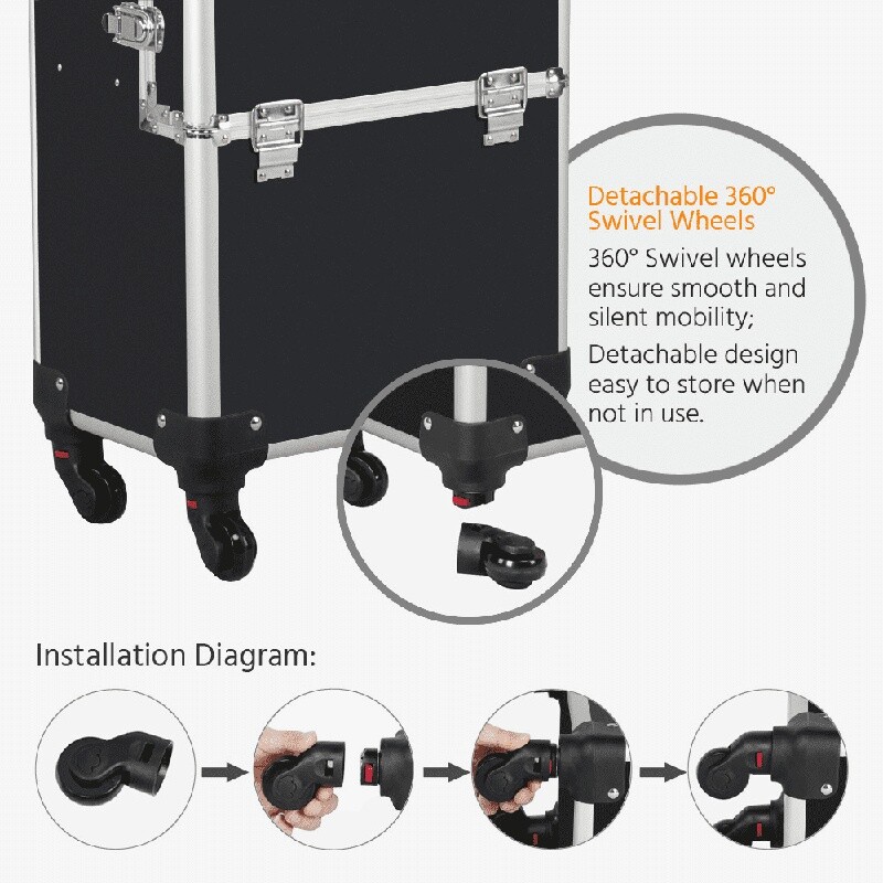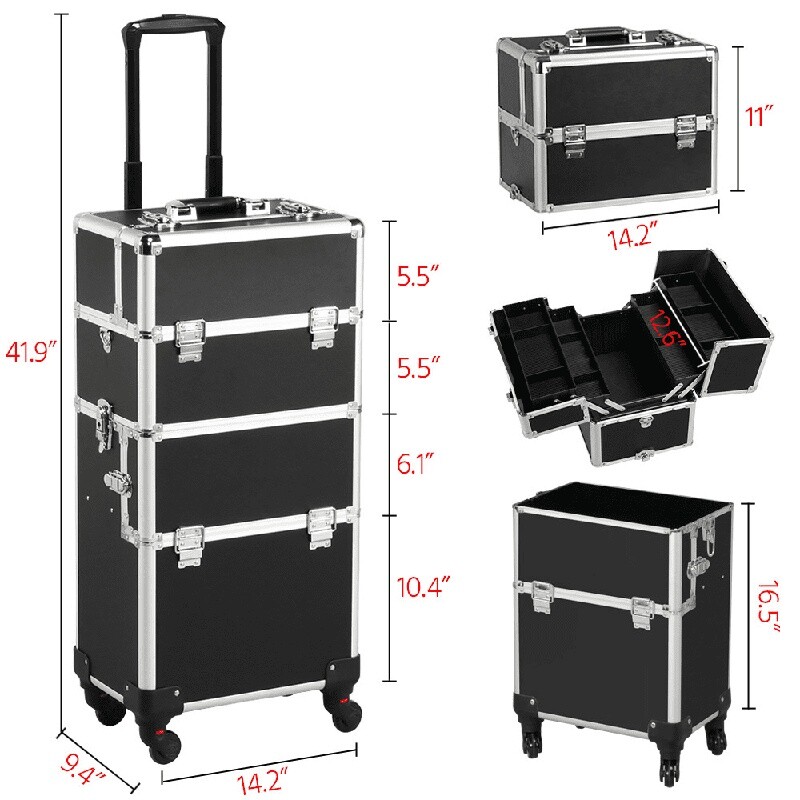 You may also like Beefy Classic Dry Dog Food Crunchy Kibble Nutrient Rich Gravy Meal 14 lb New 18.96 USD 19.96 USD Free shipping 5% off 30 Drawer Storage Cabinet Plastic Organizer Crafts Hardware Parts Wall Mount New 31.79 USD 33.46 USD Free shipping 5% off 32Qt Aluminum Steamer Pot W/ Lid Removable Tray Cooking Seafood Tamales New 39.2 USD 41.26 USD Free shipping 5% off Woven Ceramic Planter W/ Unmovable Wood Base Indoor Outdoor Plants 8 Inch New 16.15 USD 17.0 USD Free shipping 5% off 4 Slice Waffle Maker Non-Stick Removable Plates Space Saving Design Easy Cleanup 44.18 USD 46.51 USD Free shipping 5% off Heavy Duty Waterproof Tarp 20x30ft Outdoor Cover All Weather Tear Resistant New 79.93 USD 67.04 USD Free shipping 5% off Round Ceramic Orchid Planter Indoor Houseplants W/ Drainage Saucer 6 Inch New 14.68 USD 15.45 USD Free shipping 5% off Ergonomic High Back Office Chair Padded Armrests Adjustable Modern Design New 98.79 USD 103.99 USD Free shipping 5% off Round Fire Pit Cover Waterproof Durable Fabric Secure Fit Outdoor Protection New 21.06 USD 22.17 USD Free shipping 5% off Portable Foldable Director's Chair with Side Table Cup Holder Camping Backyard 37.01 USD 38.96 USD Free shipping 5% off Nonstick Carbon Steel Springform Cake Pan 6Inch Oven Safe Durable Design New 12.43 USD 13.08 USD Free shipping 5% off 9 Cup Stainless Steel Coffee Percolator Durable Design Easy Pouring Camping Use 35.73 USD 37.61 USD Free shipping 5% off This makeup train case comes with four detachable universal wheels and a telescopic pull handle for smooth pulling and rolling; A strap can be attached to the upper portion so you can carry the upper case on your shoulder, and a handle on the top of the trolley makeup case for easy lifting. Large upper and bottom compartments with no dividers can store hairdryers, hair straighteners, sprays, brush bags, and other items that are in relatively big sizes. This amazing trolley makeup case is a must-have piece for makeup artists, nail techs, hairstylists, beauticians, or those who possess a mountain of cosmetics. Professional Makeup Case, 3 in 1 Portable Trolley, Black: Material: Aluminum alloy, oxford lining, PVC, metal hardware Overall Dimension: 14. 2" L x 9. 4" W x 41. 7" H Max. Weight capacity: 66 lb G. W. : 19. 1 lb You may also like Convertible Loveseat Sofa Bed Modern Upholstered Recliner Futon Apartment Office 192.4 USD 164.78 USD Free shipping 5% off Backless Upholstered Counter Stool Comfortable Design Easy Assembly Indoor Use 113.91 USD 95.54 USD Free shipping 5% off Modern Upholstered Sofa Couch W/ 2 Pillows Durable Living Room Loveseat New 182.9 USD 153.4 USD Free shipping 5% off Single Serve Coffee Maker Hot Iced Brew Strong Brew Pause Pour 12 Cup Carafe New 184.45 USD 154.7 USD Free shipping 5% off 7-Level Cat Tree Activity Tower W/ Hammock Scratching Posts Rubber Massager Toys 105.81 USD 111.38 USD Free shipping 5% off Quad Fold High Profile Steel Bed Frame Queen Heavy Duty Tool Free Assembly New 154.95 USD 129.96 USD Free shipping 5% off 12 Piece Nonstick Aluminum Cookware Set Fry Pan Dutch Oven Saucepan Utensils New 153.45 USD 128.7 USD Free shipping 5% off 20" Hardside Luggage Spinner Wheels TSA Lock Ergonomic Handle Durable Travel Bag 83.45 USD 69.99 USD Free shipping 5% off Modern Upholstered Loveseat Sofa Couch W/ 2 Pillows Comfort & Stability New 176.7 USD 148.2 USD Free shipping 5% off Ergo Folding Chair W/ Footrest 7 Recline Positions Heavy-Duty Outdoor Use 136.99 USD 114.89 USD Free shipping 5% off 6 Person Instant Cabin Tent Dark Rest Technology Easy Setup Outdoor Camping Gear 193.75 USD 162.5 USD Free shipping 5% off 14 Inch Quad Fold Heavy Duty Steel Bed Frame Full Size No Box Spring Needed New 139.45 USD 116.96 USD Free shipping 5% off