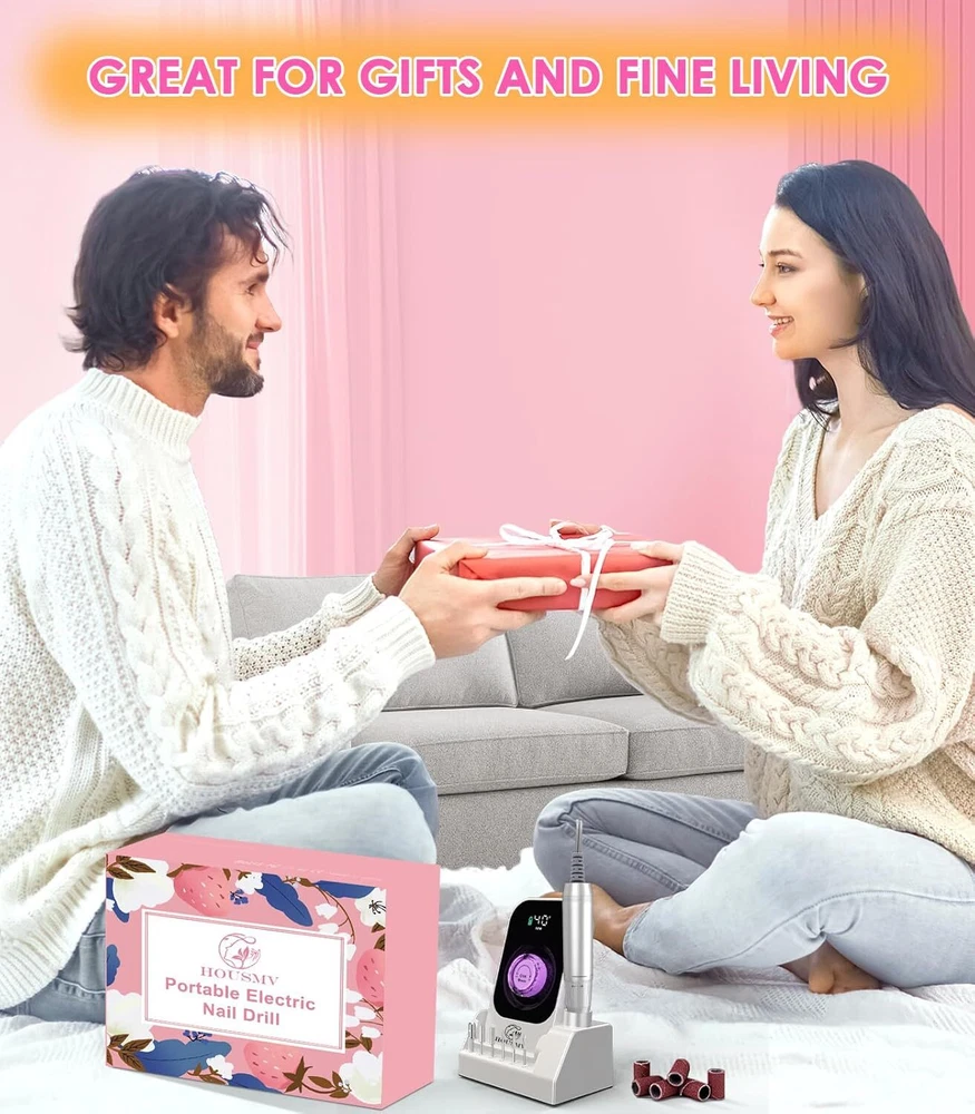 Portable Nail Drill Electric File: 40000RPM Professional Rechargeable White Product Details Brand: HOUSMV Material: Aluminum Item Weight: 0.7 Kilograms Power Source: Battery Powered Maximum Rotational Speed: 40000 RPM & : Our advanced nail drill is equipped with a powerful upgraded aluminum alloy motor and a unique ventilation system motor bearing, ensuring smooth operation even at high speeds (up to 40,000 RPM), low heat, low noise and low vibration. It is a must-have for beginners, professional nail technicians, and nail enthusiasts. - : Our rechargeable nail drill features a large capacity battery, which offers 8-10 hours of usage just on 3 hours charge. The well-designed intelligent LCD display shows the rotation direction, speed, and remaining battery level, allowing you to conveniently adjust the speed and stay informed about the battery status. : Designed to be lightweight and portable, allowing you to carry it with you anywhere, anytime. The belt clip on the back of the portable e-file nail drill machine is convenient for you to control it, making your nail care work more efficient. In addition, we've included a base design that provides storage space for drill bits and the handpiece, keeping your workspace tidy and meeting all your needs. : The twist-lock system makes changing nail drill bits extremely simple. The cordless electric nail drill also supports forward/reverse direction, allowing easy control for both left-handed and right-handed users, providing a quiet and comfortable nail care experience. - : This acrylic nail drill kit comes with 7 nail drill bits and 6 sanding bands, suitable for various purposes, such as grinding, carving, cutting, polishing, removing natural acrylics nails, gel polish dip powder nails, callus, cuticles and more. We also offer a beautiful pink present box that it is a perfect present for family and friends.