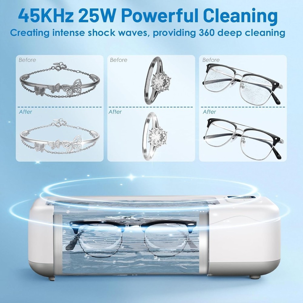 This ultrasonic jewelry cleaner is a game-changer! It effortlessly removes built-up grime from my rings and necklaces, leaving them sparkling like new. I love how versatile it is—works great on my glasses and watch too. The powerful 45kHz cleaning is gentle yet effective, and it’s so simple to use. Perfect for keeping my valuables pristine without harsh chemicals. Highly recommend for anyone who wants professional cleaning results at home!