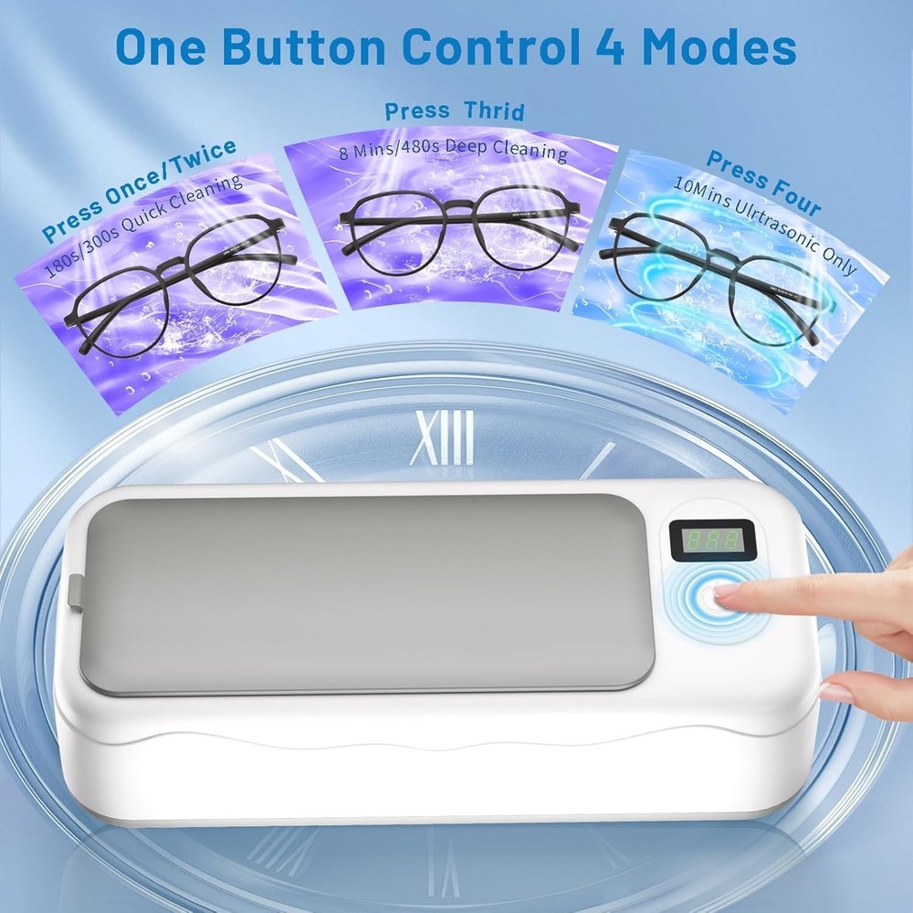 Ultrasonic Jewelry Cleaner 💎Professional-Grade Ultrasonic Cleaning Power-- Our engineered reliable, high-frequency ultrasonic jewelry cleaner delivers professional results at home. The 45,000Hz ultrasonic waves generate millions of microbubbles to deep clean hidden dirt and grime—no scrubbing needed. 🏠 For Home & Professional Use-- Refresh your valuables in minutes. This ultrasonic cleaner safely restores shine to rings, earrings, silver necklaces, eyeglasses, watch bands, dentures, coins, tools, and more. (Note: Do not remove tarnish.) 🌀 4 Cleaning Modes with Digital Display-- Choose from four preset cleaning cycles—180s, 360s, 480s, and 600s—at the touch of a button. The LED display shows real-time progress, and the built-in degas function enhances performance by eliminating trapped air. 📦 Large 20oz Stainless Steel Tank-- Built to handle more items in one go, the 600ml tank is made of durable 304 stainless steel, offering excellent resistance to corrosion and wear. Includes a watch holder for added convenience. 🔇 Low-Noise, Safe, and Easy to Use-- It is designed with four anti-slip feet to stay firmly in place and reduce vibration noise. The automatic shut-off and user-friendly one-touch control make it effortless to operate—even for first-time users.