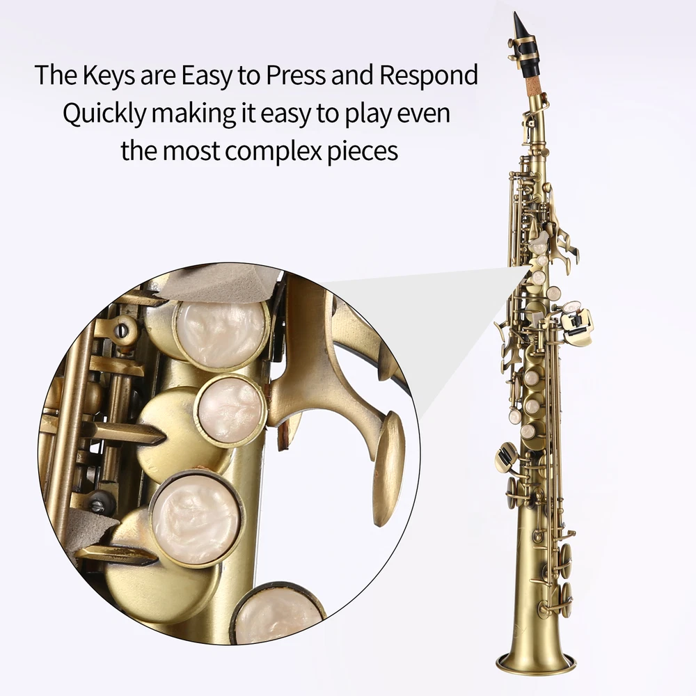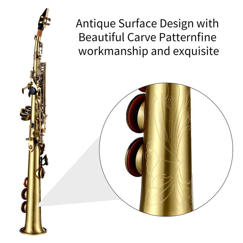 This Bb straight soprano saxophone is suitable for professional saxophonist. Made of high-quality brass material, with antique carve pattern surface , etc. Features: Bb tone straight soprano saxophone, made of high-quality brass with nickel plating. Antique surface design with beautiful carve pattern, fine workmanship and exquisite. B flat straight pipe has stronger resonance and more transparent sound quality. Water-resistant leather pads and bluing steel needle. The position and height of the sound hole opening are accurate, ensuring accuracy in pitch. The keys are easy to press and respond quickly, making it easy to play even the most complex pieces. Including carrying case, mouthpiece, straps, gloves, etc., The instrument is easy to carry, making it perfect for musicians on the go. Cleaning kit including cleaning cloth, cleaning rod, and brush, sufficient accessories to help you effectively clean the saxophone. An excellent instrument for solo playing or accompaniment in Jazz and classical music. Suitable for beginners, soloists, grading test, wind bands, etc Specifications: Material: Brass, with nickel plated Tone: Bb, F, F# Item Size: 705 * 90mm / 27.76 * 3.54in Item Weight: 1415g / 3.12lb Package Weight: 2907g / 6.41lb Package Size: 66 * 25.5 * 15.5cm / 25.98 * 10.04 * 6.10in Package List: I9003 1 * Soprano Saxophone 2 * Sax Necks 1 * Mouthpiece 1 * Mouthpiece Cap 1 * Neck Strap 10 * Reeds 1 * Sordine 3 * Cleaning Cloth 1 * Cleaning Rod 1 * Brush 1 * Pair of Gloves 2 * Case Belt 1 * Carrying Case