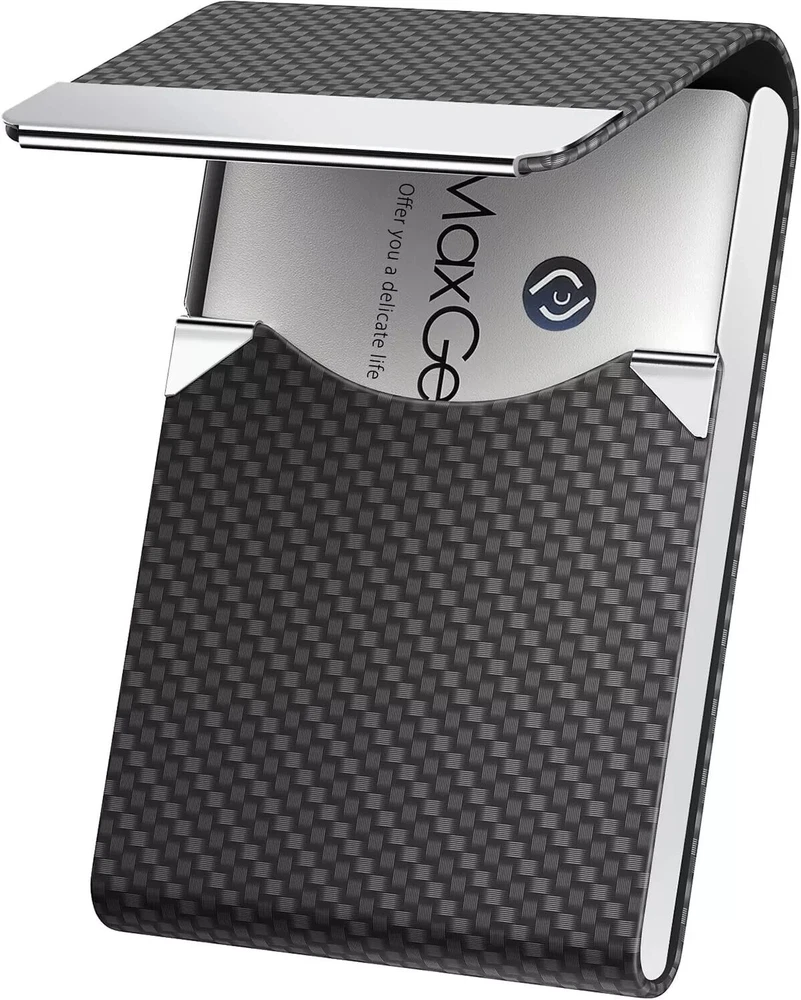 About this item QUICK ACCESS: Built-in magnetic closure, you can easily access any of the cards stored in there. ULTRA SLIM & COMPACT: Hold about 15-25 business cards (according to the thickness of your cards) or 4-8 credit cards. Minimalist enough that you can fits perfectly in your small pocket, briefcase, handbag. PREMIUM MATERIALS: High quality PU leather combined with stainless steel creates a unique style card case. RFID BLOCKING: RFID secure design protect your cards from unwanted wireless communication.