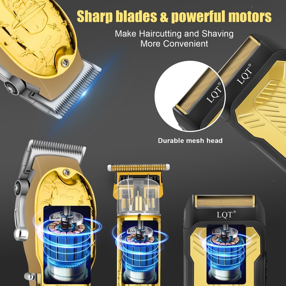 Professional Hair Clipper Set for Men Electric Shaver Razor Cordless Hair Cutting Barber Clippers Beard Trimmer Men’s Grooming Kit Gifts for him (Gold) Product Details Color: Gold Brand: LQT MPN: LQT-300 kit UPC: 797999867508 EAN: 0797999867508 Brand: LQT Battery Description: Lithium-Ion Included Components: Barber Cape, Guide Combs, Cleaning Brush, T-blade Trimmer, Hair Clipper, Barber's Comb, USB Cable See more Runtime: 2 hours Unit Count: 1 Count Package Dimensions : 11.93 x 7.87 x 3.43 inches; 2.55 Pounds Item model number : LQT-300 kit Batteries : 1 Lithium Ion batteries required. (included) Date First Available : November 8, 2024 Manufacturer : LQT Country of Origin : China PROFESSIONAL HAIR CLIPPERS SETThe LQT professional hair clipper set perfectly matched to create any hairstyle you want,metal embossed body design,unique scissors logo,this haircut kit not only can show your style taste,but also meet your daily haircut needs,perfect for home use,barbershop and travel. UPGRADE ACCESSORIES The LQT clippers for men equipped with 4 guide combs(,3,6,10,13,mm) ,The T-blade trimmer equipped with 4 guide combs (1.5,2,3,4,mm),a barber cape,3 cleaning brush, 3 USB charging cables,a barber's comb, Suitable for both professional in a salon or barbershop and home hair cuts as well as beard trimming. Powerful motor and large capacity batteryThe LQT hair clipper contains a high-capacity battery that can be used for 120 minutes after 2 hours of charging. The engraving machine can be used for 3 hours after 3 hours of charging. The shaving machine can be used for 160 minutes after 1.5 hours of charging, and can be connected to a USB adapter, laptop, and car charger using the USB charging port. SUPER SHARP & SKIN-FRIENDLY BLADEThe blades are made up of high quality stainless steel,men hair clippers allow you to easily design your hairstyle and shape the edges. Full metal body, Sharp and safe blade design,Even if you trim the thickest hair, it will not pull any hair. The R-shaped obtuse edge design makes gentle contact with the skin and will not harm your skin. Only the blades can be rinsed,easy to clean. Gifts for Men & Women This electric trimmer set can satisfy daily hair trimming and can also be used as an electric shaver for shaving and trimming body hair, etc.It is an all-in-one set and is very suitable as a gift for a partner who likes to trim hair at home. It can be given as a birthday gift, Christmas gift, Valentine's Day gift, Father's Day gift, Mother's Day gift.