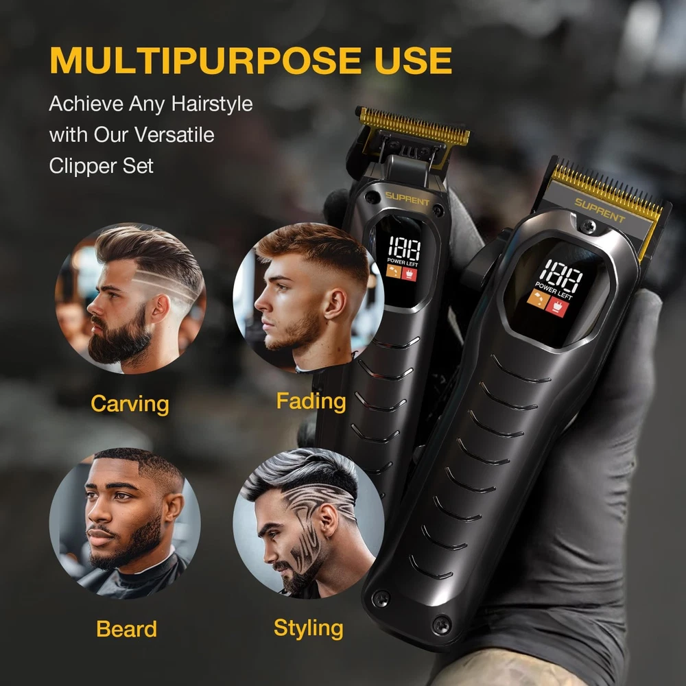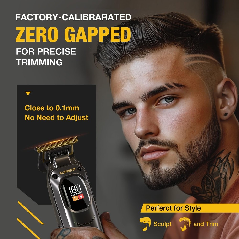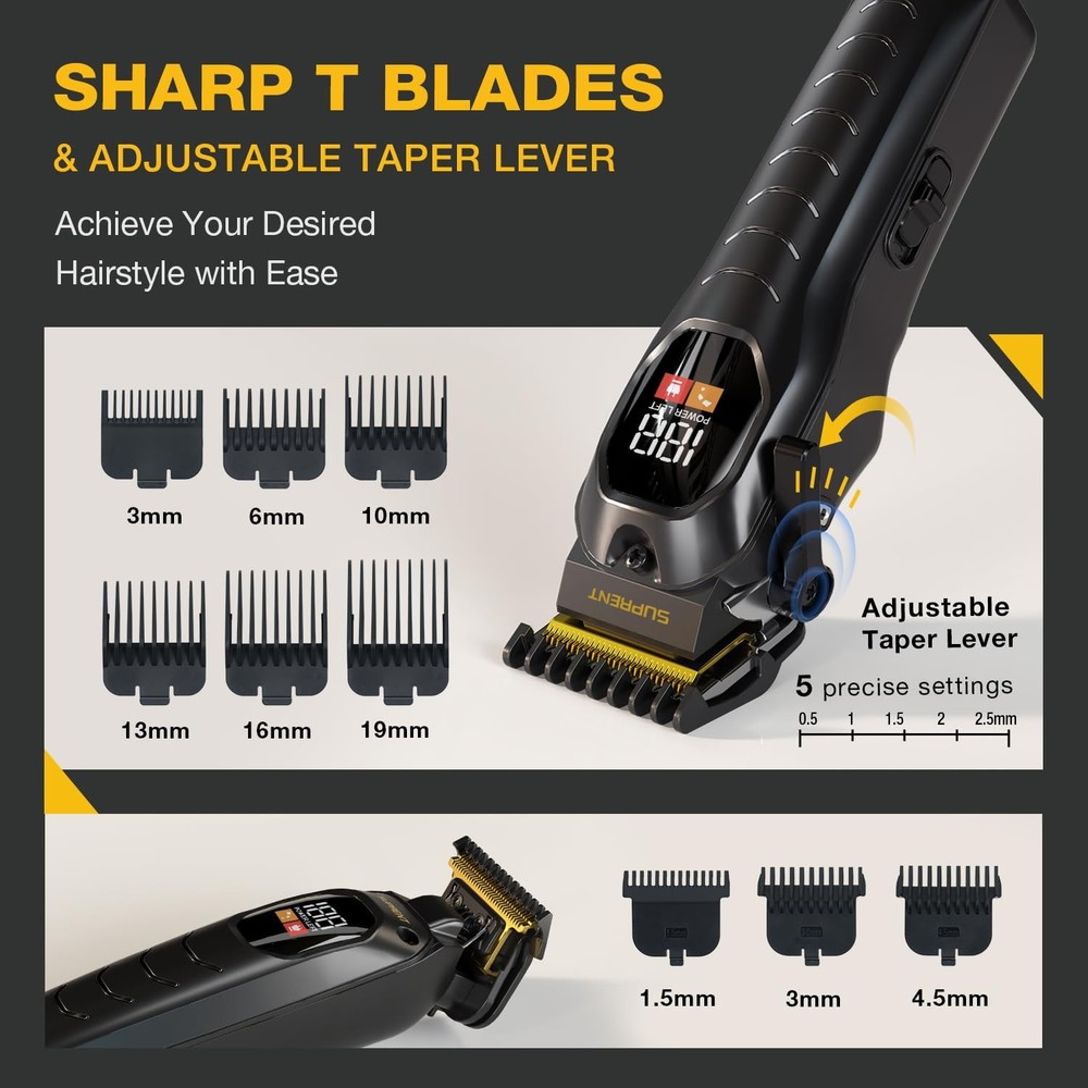 QUIET & POWERFUL MOTOR: The hair clipper boasts a robust 6000rpm motor, effortlessly tackling even the thickest, most unruly hair. Equipped with self-sharpening titanium blades, the mens hair clipper delivers clean, fast trims without snags or pulling, ensuring a professional-looking finish every time. MULTI-FUNCTIONAL HAIR KIT FOR BARBERS AND THE HOME: This professional hair kit includes everything you need for a professional-quality haircut at home. The adjustable blade (0.5/1/1.5/2/2.5mm) and six cutting combs offer a variety of styles, while the T-shaped blade trimmer with three connecting combs is perfect for intricate details and beard styling. Whether you like to shave or grow your beard, this cordless hair clipper has everything you need. PRECISE ZERO GAP DESIGN:This hair clipper adopts a factory calibrated zero gap design (close to 0.1mm), which can achieve seamless transitions and sharp lines, making it very suitable for complex gradients, collars, and clean and neat designs. A gift suitable for hairdressers and stylists who require ultimate control - SUPERRENT trimmer. PRECISE ZERO GAP DESIGN:This hair clipper adopts a factory calibrated zero gap design (close to 0.1mm), which can achieve seamless transitions and sharp lines, making it very suitable for complex gradients, collars, and clean and neat designs. A gift suitable for hairdressers and stylists who require ultimate control - SUPERRENT trimmer. LIGHTWEIGHT AND ERGONOMIC COMFORT: With our lightweight and ergonomic design, you can enjoy comfortable use during long clippering. The low vibration and balanced weight of this men's hair clipper minimize hand fatigue to the greatest extent possible. Whether you are a professional hairdresser who uses hair clippers all day long or a family user who enjoys a comfortable hair cutting experience, the design of hair clippers is meant to make your hands feel fresh.