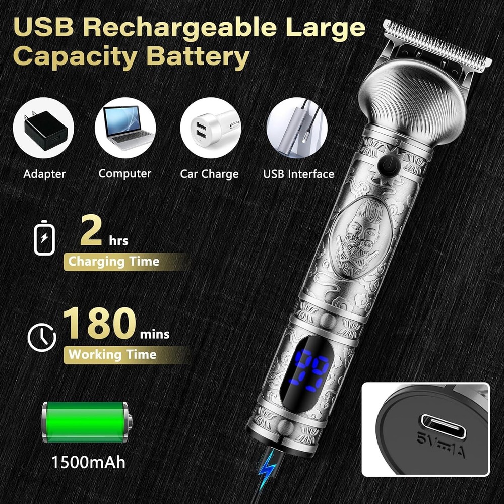 Beard Trimmer for Men, Hair Clipper Trimmer for Men, Cordless Beard Grooming Kit Description : [6 in 1 Beard Grooming Kit] -The beard trimmer grooming kit includes 6 detachable trimmer heads, a T-blade body nose hair face trimmer equipped with 4 guide combs (1.5/3/6/9mm), a hair cutting razor equipped with 4 guide combs (1.5/3/6/9mm), a design trimmer, a micro shaver, a nose trimmer, a body shaver. The The beard trimmer includes 18 accessories, meet the daily electric trimmer's needs. [ Zero Gapped & T-Blade] - The zero gapped t-blade clippers is made of high quality stainless steel with self-sharpening capability. Beard trimmer for men is sharp enough to cut through fine, coarse and thick hair/beard without pulling hair or hurting the scalp. The hair clippers blade (not the body) can be rinsed under running water and be included brush for thorough cleaning. [ Powerful Motor ]- Full metal body design, comfortable grip, 6 replacement heads are very easy to install. Equipped with a powerful 6200 RPM motor and self-sharpening blade. You can easily trim hidden hairs with the electric trimmer, even in narrow areas such as the abdomen, back and buttocks. The silent upgrade motor allows you to sleep at night and in the morning without disturbing your family. [ LED Display & USB Fast Charge] - Professional close hair and beard trimmer for men has a large built-in smart LED display that shows the battery level and reminds you to recharge for trimmer for men. Plus Type-C fast charging, hair clippers for men can be fully charged in just 2 hours and can shave for 180 minutes on a full charge. No more worry about the electricity of the beard trimmer. [Ergonomic Design ] - Electric razor for men use for body/beard/face/nose/ear hair trimmer easy to hold and use, you can hold the trimmer for a long time, but hand and arm won't feel sore. Weighing less than 200g, hair clippers is easy to use even for women, beginners. Retro body design, atmospheric and aesthetic, sure your husband/dad/boyfriend will love this.