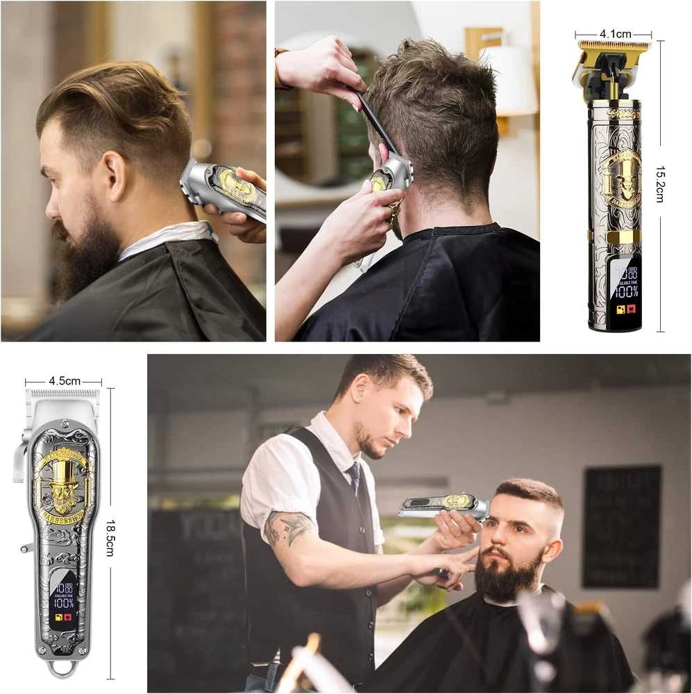 【Hair Clippers Kit for Barbers】: Our professional barber combo includes: A cordless hair clipper equipped with 8 guide combs (3/6/10/13/16/19/22/25 mm), a t liners clippers for men equipped with 6 guides (1/2/3/4/5/6 mm), lubricating oil, cleaning brush, 2 USB charging cable, and a barber's comb. 【Powerful Motor & Adjustable mens Hair Clippers】: This wireless hair clipper machine has a 10W powerful motor with a speed of 7000 RPM. The left adjustment level change adjusts 4 different cutting lengths(0.5-1.7 mm). 【Smart LED Display】: The LED displays can clearly display the remaining battery percentage, speed, fuel quantity reminder, and charging reminder. 【High Capacity Battery】The hair clippers are wireless for hair cutting built-in rechargeable 2000mAh high-quality lithium-ion battery, charged for 3 hours to provide up to 180 minutes of running time. The beard trimmer for men can run for at least 200 minutes after 2.5 hours fully charged. 【WARRANTY & AFTER-SALE SERVICE】We provide a year warranty on the barber clippers professional sets. If you have anything, please directly contact us and we will reply to you within 24 hours. Product Description Great Clipper Set! HINEA PRO-A Brand that Focusing on Producing Great Products. The video showcases the product in use. The video guides you through product setup. The video compares multiple products. The video shows the product being unpacked. 1 Leading Quality 2 Super Battery Life 3 Sharp Blades 4 Powerful Motor 5 Long Working Hours Barber Set Black HIENA PRO Barber Set Smart LED Display Super Battery Life Powerful Motor Adjustable Blades Smart LED Display Super Battery Life Powerful Motor Adjustable Blades Smart LED Display Super Battery Life Powerful Motor Adjustable Blades Smart LED Display Super Battery Life Powerful Motor Adjustable Blades Dragon Barber Set black Classic Black Gold Golden Pure Black Set HIENA PRO hair clipper set waterproof? No, this cordless clipper is not waterproof, please do not put this barber clippers professional sets into water, you can use a brush to clean it. Can the HINEA PRO wireless hair clippers kit be used while charging? Sure, Our Hair Clippers and T-Blade Trimmer Set can be used while wired and wireless. Are the blades of the HINEA PRO barber set universal and where can I buy them? If you need a replacement blade, you don't need to buy one, we'll send you a new one blade right away. Home & Barber Use Best Gift Choice Adijustable Length