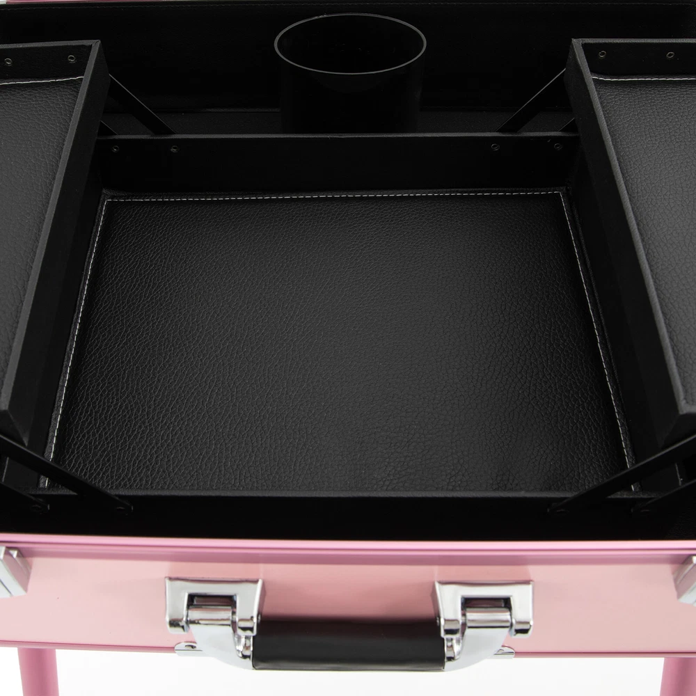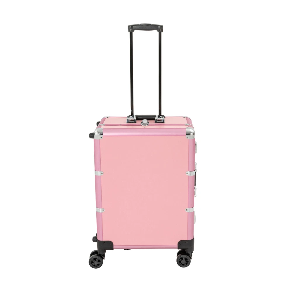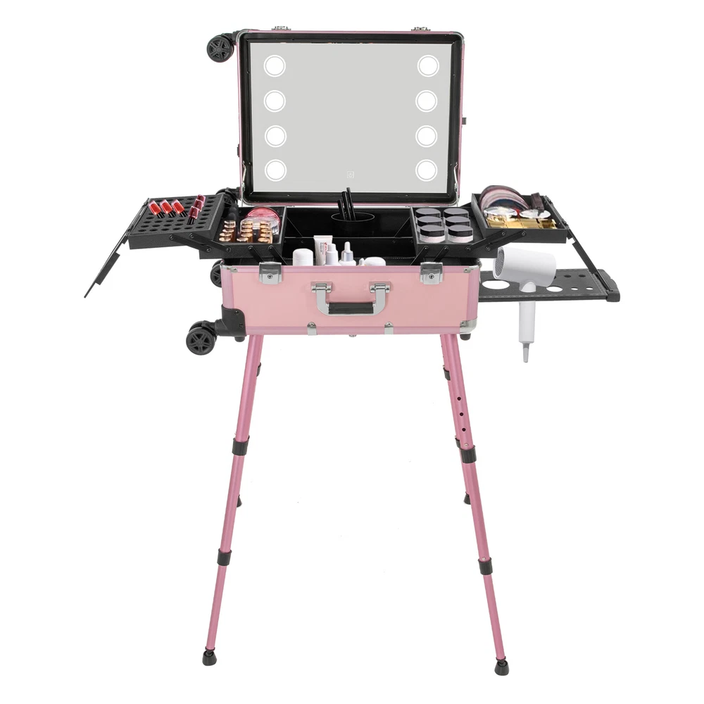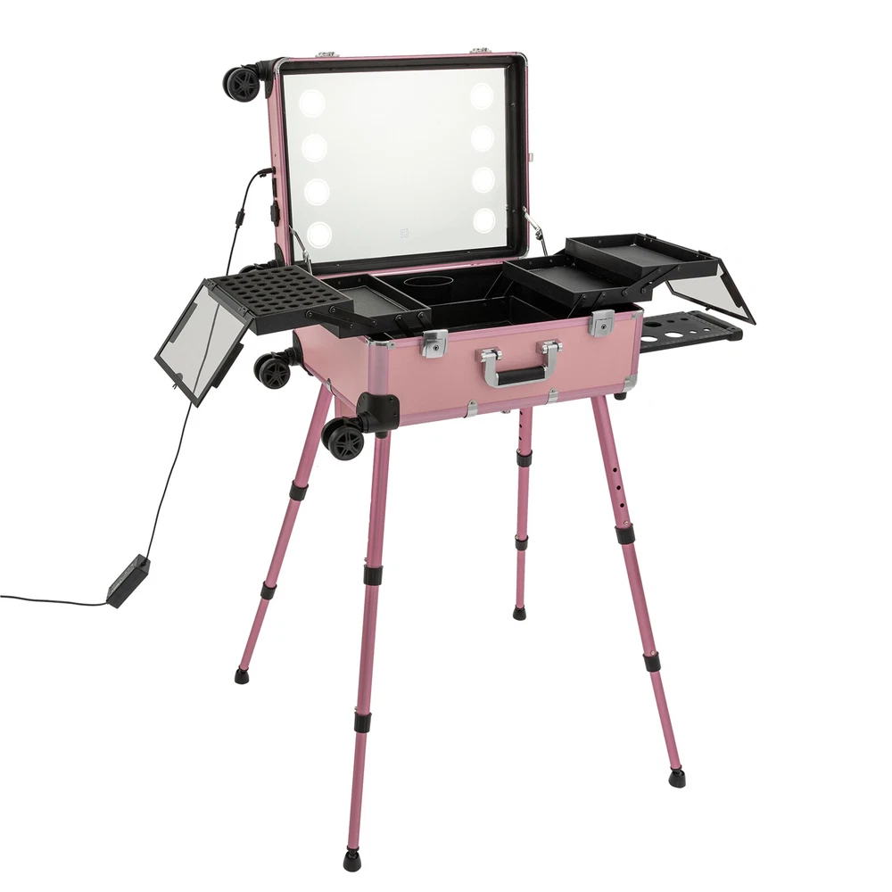 Professional Cosmetic Travel Case Vanity Organizer Rolling Makeup Train Case Box Professional Cosmetic Travel Case Vanity Organizer Rolling Makeup Train Case Description If you are a make-up artist and embroiderer who often needs to go out to work, you will need our makeup train case, combining the suitcase with the four legs, which is very convenient. Our makeup train case with high durability, 4 universal wheels, a large capacity, built-in LED 3-color lights, and a chargeable design will be your excellent makeup assistant when outgoing. Key Features Long Service Life: With the high-quality aluminum alloy and decorative high-pressure laminate, this product is anti-corrosion, flame-resistant , and rustproof and is not easily deformed, thus ensuring a long service life. Large Capacity: The 3-tier design with 5 collapsible&detachable inner boxes and a makeup brush holder can orderly sort and store your makeup/tools while well protecting them from scratches because of PU&MDF lining. And the retractable side tray can hold your hairdryer, flat iron, curling iron, etc. Excellent Load-bearing Capacity: The four supporting feet at the bottom and the aluminum alloy frame provide the make-up case with a maximum weight-bearing capacity of 110.23 lbs. You can place all kinds of hairdressing and beauty tools on it with confidence. Professional Make-up Assistant: The 8 LED lights(each 2.17" in diameter) with adjustable brightness and 3 light colors(warm, natural, and cold light) provide an ideal view for your different makeup needs without worrying about unwanted glare/shadows while protecting your eyes, together with the high-transparency resin mirror, helping you achieve flawless professional makeup. You can long press the button on the mirror to adjust the brightness and short press it to change the light color. Adjustable Height: With the 4-gear height adjustable quadripod(32.3 inches), you can find the height that suits you best to have enjoyable makeup without back pain . Built-in Retractable Quardipod: The built-in retractable quardipod can be stretched when needed or folded when not in use, enabling quick switching between the two usage modes without disassembly. The adjustable foot pads of the quardipod adapt to uneven ground. Thoughtful Design: The 12V rechargeable jack, external power supply jack, and power jack with a dustproof cover on the case will bring more convenience to your operation. Stylish Appearance: The rectangular frame with simple&elegant lines and lively pink embellished with a little black&silver gives this product a stylish look, which is a brilliant view when you are carrying it outside. Ideal Gift: Its exquisite design and large capacity make this product a great gift to your mother, girlfriend, sisters, wife, and loved ones. They would be fond of it. Easy to Move&Carry: The 4 nylon universal wheels ensure silent and smooth rolling and its detachable design allows for convenient replacement. Along with the telescopic pull rod and 2 comfortable handles, you can carry this product with less effort. Protective Shipping: In order to prevent the product from being damaged and bumped during transportation, we fill the package with anti-collision foam to protect your products to the maximum extent possible. Specifications Alloy Cladding Corners: The alloy cladding corners with a round design can not only protect your case from Verdana but also better care for your skin. Flat Built-in Bulb: This design makes the bulbs not easy to break. When the case is closed, it does not occupy the interior space of the case. Non-slip Feet: The non-slip feet enhance the stability of the product without slipping and bring you a better user experience. Clear Inner Box Lid: The clear inner box lid with a latch lock allows you to view the inside items and avoids them from falling. Locks and Latch: The two locks on the side and the latch on the top are solid and durable to effectively protect the inside items from losing. Application Professional makeup artists, hairdressers, beauticians, manicurists, beauty lovers, etc. can use this product to store cosmetics and makeup tools. It is ideal for makeup contests, wedding makeup scenarios, travel makeup, outdoor shooting, cinemas, dressing rooms, crew, tourism, beauty salons, and more. How to Use 1. Open the bottom plate buckle. 2. Extract the quardipod and clamp it in place. 3. Adjust the suitable length. 4. Place the product upright. 5. Open the box. 6. Open the lock inside the box and pull out the small box inside. 7. Connect the power supply as needed and start using it. Specification Color: Pink Shape: Rectangular Material: Aluminum Alloy, Decorative High-pressure Laminate, Resin Wheel Material: Nylon Surface Treatment: Oxidation Plug: US Standard Mounting Type: Free Standing Light Color Type: Warm Light, Neutral Light, Cold Light Number of Wheels: 4 Voltage: 12V Bulb Type: 8*5W LED Bulbs (Included) Max. Load-bearing Capacity: 50kg/110.23lbs Gross Weight: 14kg/30.86lbs Net Weight: 12kg/26.46lbs Each Light Source Diameter: 5.5cm/2.17inch Mirror Size(L*W): 49*36cm/19.3*14inch Each Tray Size: 16.5*26.5*3cm/6.5*10.4*1.2inch Top Cover Size(L*W): 52*40cm/20.5*15.7inch Overall Height: 133cm/52.4inch Supporting Leg Max. Height: 82cm/32.3inch Tray Distance From Floor: 96cm/37.8in Package Size: 67.5*51*29cm/26.57*20.08*11.42inch Package Included 1 x Makeup Train Case 2 x Power Cords 1x USB Cable 2 x Keys Notes Please do not use high-voltage plugs as they may burn out the product. This product is an 8-light model without audio and Bluetooth functions. The support legs need to be tightened slightly before being supported. The service wear of the case is a normal phenomenon. In the process of daily use, please try to avoid excessive Verdana and drop to extend the lifespan of the product. Please use soft tools and water to clean. Please keep away from corrosive liquids. Please avoid long-term exposure to the sun. Please clear the wheels in time to maintain smoo