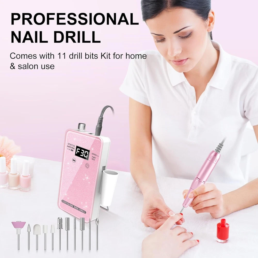 Professional Electric Nail Drill File:COSYGLOW Glitter Portable Cordless Pink Product Details Product Dimensions : 3.5 x 1.5 x 5.5 inches; 1.39 Pounds Item model number : R9 Plus Batteries : 1 Lithium Ion batteries required. (included) Manufacturer : COSYGLOW Country of Origin : China Brand: COSYGLOW Material: Metal, Acrylonitrile Butadiene Styrene (ABS) Model Name: R9 Plus Product Dimensions: 3.5"L x 1.5"W x 5.5"H Item Weight: 0.63 Kilograms Glitter Design Portable Nail Drill: This nail drill made of sturdy and durable reinforced glass and ABS material. It has a beautiful appearance and unique design. The specially designed glittery accents not only enhance the aesthetic appeal of the nail drill but also add an eye-catching sparkle. Adjustable Speed up to 30,000 RPM: Equipped with high-quality bearings, this professional nail drill allows you to smoothly operate at speeds ranging from 0 to 30,000 RPM by simply rotating the speed control knob. This makes it an ideal nail drill machine for both experienced salon technicians and beginners starting their nail care journey at home or in the salon. Low Heat & Low Noise & Low Vibration: Our electric nail drill is durable, low heat, low noise and low vibration. The aluminum alloy shell and the ventilation holes prevent the handpiece from overheating; lightweight and ergonomic design makes it comfortable to use. The handpiece fits 3/32-inch drill bits. The twist locking chuck for easy drills replacement. Large battery capacity and Rechargeable: With a large 3600mAh battery capacity, this electric nail file can be used anytime, anywhere. The included adapter allows you to conveniently recharge the cordless nail drill, which can provide 8-10 hours of runtime after a 2-3 hour full charge. Multifunctional Nail Kit: With 11 kinds of professional nail drill bits and 36pcs sanding bands, This nail drill can meets all your multiple manicures needs for trimming, grinding, carving, cutting, polishing for all nail arts as well as cuticle removal. This beautiful nail drill kit makes an excellent gift option, whether for personal use or for friends and family.