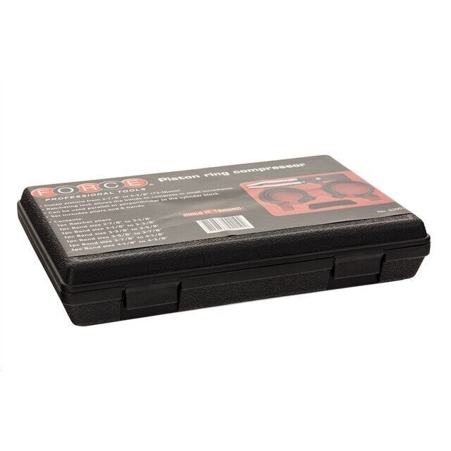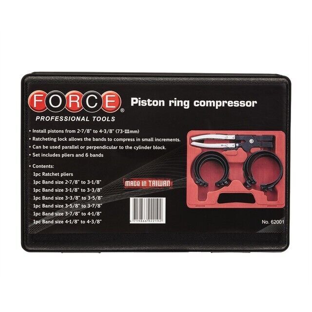 62001 Force Piston Ring Compressor Product Description These Force Piston Compressors are ideal for almost any workshop or garage.Installs most pistons from 2-7/8" To 4-3/8" (73-111mm) & can be used on parallel orperpendicular to cylinder block. Includes 6 x bands & 1 x set of ratcheting pliers which feature ratcheting lock allowing for bands to compress in smaller increments. Force Piston Compressor Installs Sizes 2-7/8" To 4-3/8" Ratcheting Lock Can Be Used Parallel Or Perpendicular To Cylinder Block 1 x Ratchet Pliers 1 x 2-7/8" To 3-1/8" Band 1 x 3-1/8" To 3-3/8" Band 1 x 3-3/8" To 3-5/8" Band 1 x 3-5/8" To 3-7/8" Band 1 x 3-7/8" To 4-1/8" Band 1 x 4-1/8" To 4-3/8" Band Shipping Weight 2kg Warranty: Limited Lifetime Warranty Technical Specifications Brand Force Weight 2kg Listing and template services provided by inkFrog