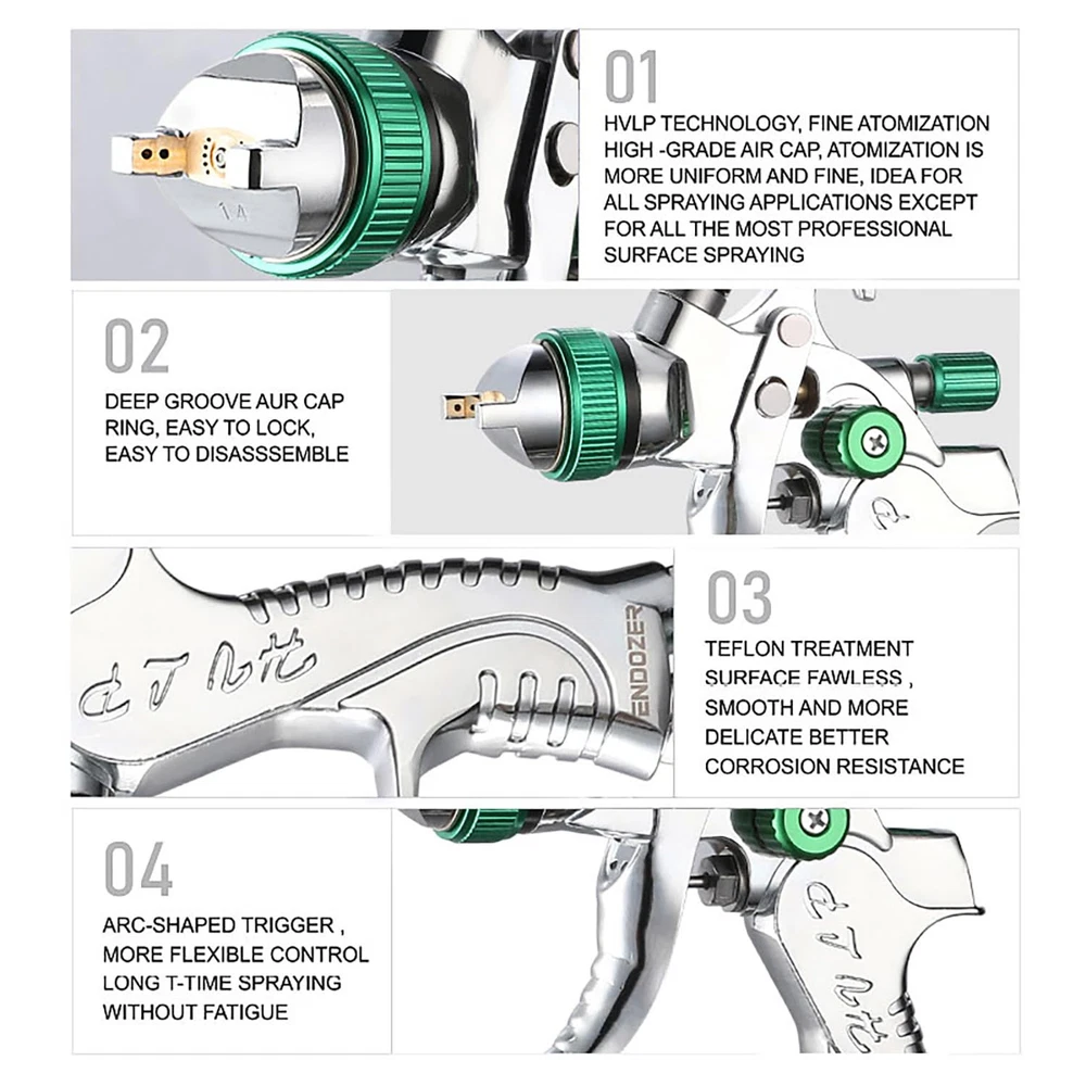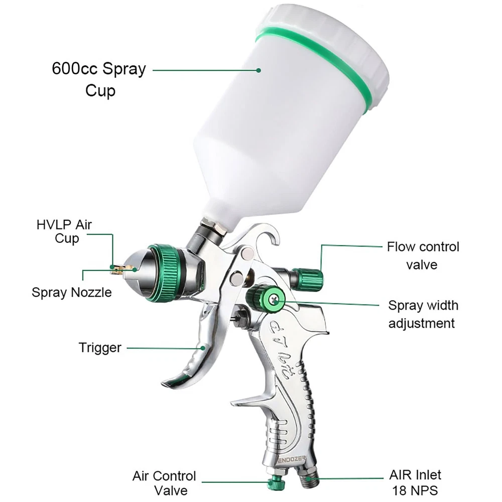 This spray is supplied with a 20 oz. (600 ml) gravity feed cup, with 1.4 1.7 2.0mm real stainless steel nozzle and needle. The hvlp spray hood is made of brass, wear-resistant and corrosion-resistant, 15 holes design, uniform atomization, excellent effect. 1/4 "NPT inlet and quick adapter of the same specification. Fluid control adjusts the amount of spray paint, pattern control adjusts the fan pattern size, and the air conditioning valve provides the ability to adjust the air flow rate. It is designed to provide uniform spraying and particle size for all types of surface coatings. In the painting process effective paint filter(product contains) recommended to reduce any small pieces of dried paint or pollutant in the fluids to ensure a perfect finish. In addition, this air spray case also includes accessories such as air pressure gauge, quick adapter set, etc., with various usage scenarios. spray paint can be used for various purposes such as furniture repair, mural painting, car painting, painting, arts and crafts, paint coating of industrial products, spray paint of factories, and model making. HVLP air spray that is easy to use even for beginners
