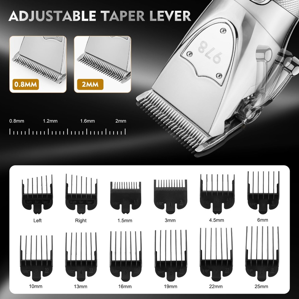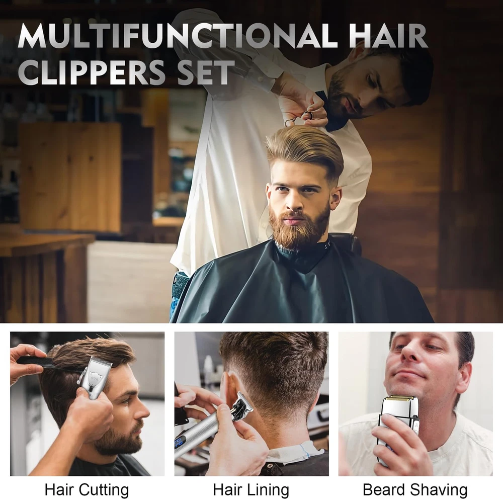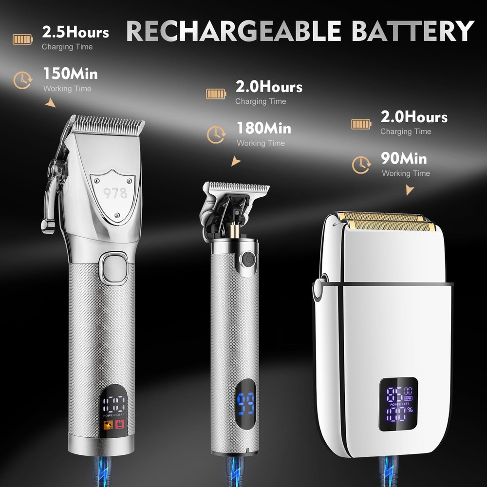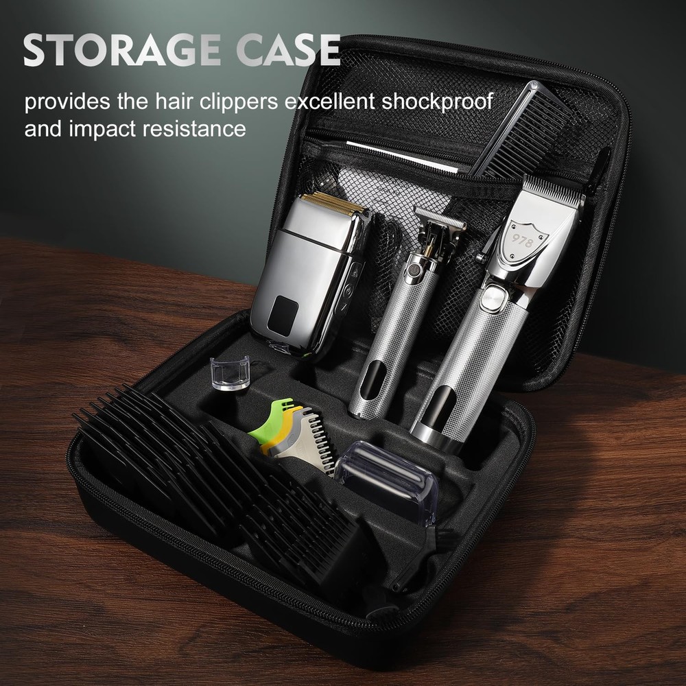 Make Your Perfect Hair Style Anywhere: This professional hair cutting kit comes with 12pcs hair clippers guard attachments (1.5-25mm & left/right ear taper), 4pcs hair trimmer guards(1-4mm), ideal for fading & blending, your ability to create is truly without limitation whether you are at home or barbershop. Professional Barber Kit with Case: This clippers and trimmers set combines the functions of hair clipper, detail trimmer and electric shaver for achieving all hair styles. with EVA bag, easy to carry and storage. Ideal for beauty salon or barbershop stylist and home haircuts. Digital LED Display & High Capacity Battery: Hair clippers can run up to 150 minutes for multiple cuts after 2.5 hours charge. Hair trimmer can run up to 180 minutes after 2 hours charge. Foil shaver can run up to 90 minutes after 2 hours charge. LED display clearly shows the remaining power, the charge status, and lubrication reminders. Powerful Motor & Low Noise : professional barber kit is equipped with a high-performance rotary motor 6500RPM. Which can provide high-performance precise trimming, achieving long-lasting durability in any style. Equipped with the latest noise reduction technology makes the noise less than 60 decibels. Very suitable for children. Ultra Sharp High Carbon Steel Blade: The blade of cordless clipper is sharp enough to cut through thick hair with no pulling or snagging. The electric shaver has two separate floating blades and an ultra-thin blade unit to easily and quickly trimming all facial hair of your skin. The design of the zero gaped precision trimmer makes it easy to trim hair, beard, face and sideburns.