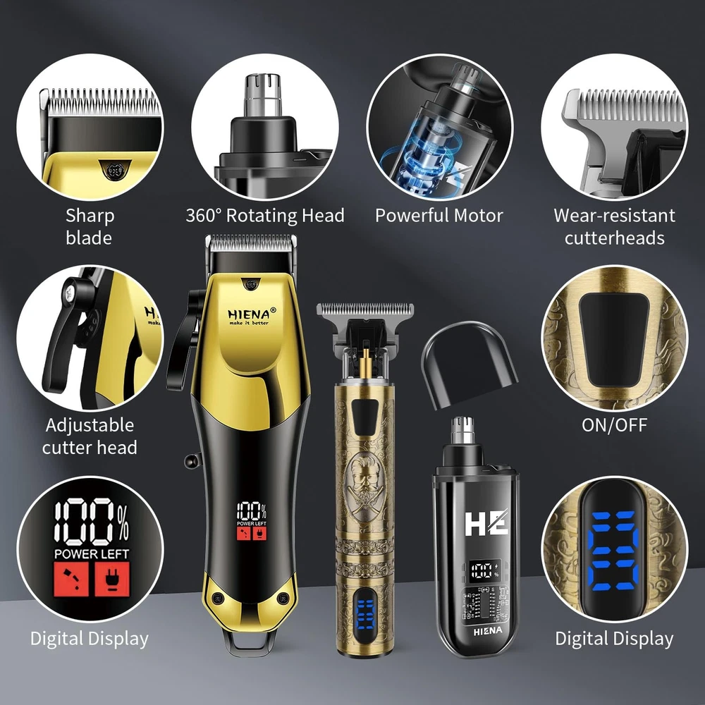 Elevate your grooming experience with our state-of-the-art Hair Clipper set, a must-have tool for both home users and professional barbers!This versatile hair clipper features an adjustable blade and a wide array of limit combs, specifically designed for precise and customized cuts.Equipped with an innovative adjustable lever, the larger clipper allows you to seamlessly adjust the blade length, catering to all hair types. The set includes 8 distinct limit combs, ensuring you have the perfect length options at your fingertips: 1.5mm, 3mm, 4.5mm, 6mm for the clipper, and 1.5mm, 2mm, 3mm, 4mmfor the trimmer, offering you versatility for any grooming requirement.What's more, this set comprises a high-quality cordless nose and ear hair trimmer, engineered for 360° multi-directional trimming. The premium stainless steel blade guarantees effective and comfortable removal of unwanted facial hair, while its double-edged design ensures a smooth and efficient cut. The included dust cover protects the trimming head when not in use, making maintenance and cleanliness a breeze.Experience effortless cutting power with our Powerful & Quiet Motor, designed to handle a variety of hair types with exceptional speed while minimizing noise to ensure a comfortable environment for both you and those around you.Smart LCD Display: Stay informed with the smart LED display on our professional Hair Clipper. It provides clear battery percentages ranging from 0 to 100%, alongside intelligent reminders for charging, maintenance, and cleaning. This user-friendly interface allows for easy monitoring, so you can always keep your grooming tools in optimal condition. 600mAh battery that fully charges in just 120 minutes, providing an impressive runtime of up to 2 hours. The trimmer can be completely charged in 180 minutes for up to 3 hours of continuous use, while the nasal hair trimmer only requires 1 hour for a 40-minute operation. This hair clipper set is perfect for travel, as it can be charged conveniently via a computer, car charger, or the included USB cable, ensuring you are always ready to go.Perfect for long grooming sessions, this clipper allows you to maneuver with ease and style no cords to hold you back! Whether you're treating yourself or searching for the perfect gift for a loved one, the Hair Clipper set is an essential addition to any grooming toolkit. Unleash your creativity in hair design while enjoying the ease and efficiency of our superb grooming clipper. Don't miss out on the chance to transform your hair cutting routine today! 【Adjustable Blade & Limit Combs】This Professional Hair Clipper Set includes everything you need, a large machine for quickly cutting hair, and comes with an adjustable lever that allows users to easily adjust the blades. In addition, it also includes four different limit combs, with clippers of 1.5mm, 3mm, 4.5mm, and 6mm and trimmers of 1mm, 2mm, and 3mm, providing more length options. 【360°Multi-Directional Trimming】The nose hair trimmer has 360°multi-directional trimming, which can effectively and comfortably remove excess facial hair, such as the nose and ears, and is equipped with a dust cover to protect the head when not in use, making it easy to clean and maintain. 【Quiet & Durable Motor】This professional hair cutting set is equipped with a powerful and quiet motor, which can easily cut different types of hair while maintaining low noise and not disturbing you and your family. 【Smart LCD Display】This professional hair clipper set features a clear smart LED screen that displays battery percentages from 0 to 100.It also includes intelligent reminders for charging, refueling, and cleaning, making it convenient for users to access various status displays. 【600mAh Large Battery & USB】This hair clipper set is equipped with a large capacity battery. and the large clipper can be fully charged in just 120 minutes, It runs for up to 2 hours. In addition, the trimmer can be fully charged in just 180 minutes and can continue to work for up to 3 hours; The nasal hair device can be fully charged in just 1 hour and run for up to 40 minutes. It is easy to carry and very suitable for travel. You can use your computer, car charger, and even our USB charging cable to charge them anywhere. 【Ideal Gift Selections】The excellent appearance and performance make our best hair clipper set the perfect gift for hairdressers. It's perfect for Christmas, New Year's Day, Birthdays, Valentine's Day, etc. Please feel free to treat this product as a gift. We believe that your family or friends will be very satisfied with our products and enjoy the experience of using them.