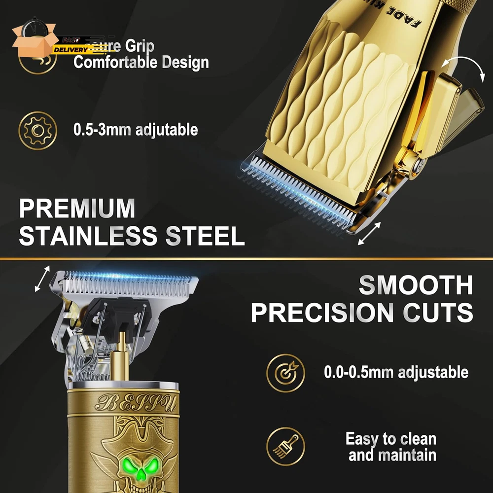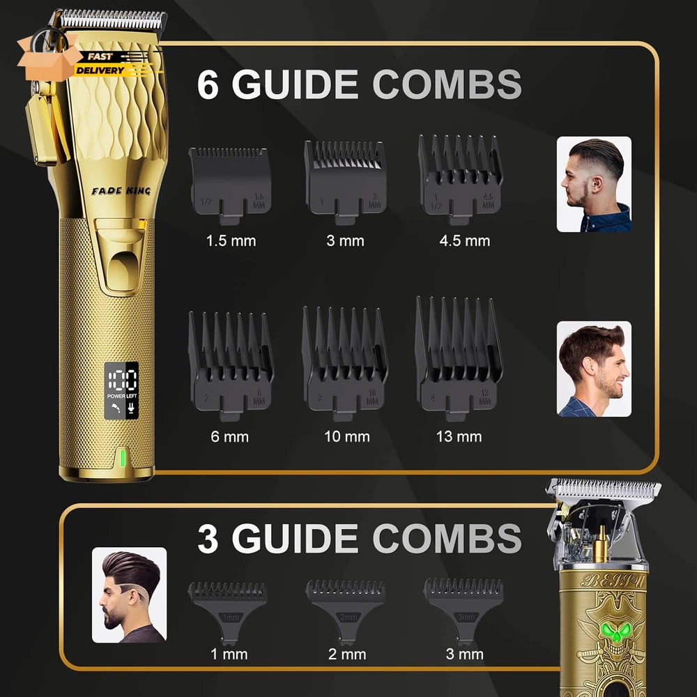 Store New Arrivals Add to Favorite View Feedback Contact ® Professional Hair Clippers for Men - Cordless Hair Clippers, LCD Display Barber Clippers for Hair Cutting & Mens Grooming with Travel Case (Gold+Bronze) Description Item model number Q1S-Y5 Style CLIPPER+TRIMMER Color Gold+bronze Product Dimensions 2.09 x 1.85 x 7.2 inches; 2.2 Pounds Country of Origin China Hair Type All, Oily, Wavy, Dry, Curly, Fine, Normal, Straight Item Weight 2.2 Pounds Batteries 2 Lithium Ion batteries required. Recommended Uses For Product Beard, Chest, Head, Bikini Line, Mustache, Neck, Under Arm, Face, Body Professional Precision: The Fadeking hair clippers and trimmer set is engineered to deliver exceptional cutting performance for professional and home use;Designed to create seamless blends during both hard and soft line fading;Features high-precision hair cutting scissors that cater to a variety of styling needs, ensuring excellent results for all users Stylish And Versatile: These barber clippers are equipped with adjustable blades that enable precise blending and the creation of sharp, clean edges;The durable zinc alloy housing is built to endure the demands of regular salon and home use, ensuring long-term reliability and performance;Their sleek design not only looks professional but also provides functionality and ease of use Powerful Rotary Motor And Long Battery Life: The barber kit features a high-performance rotary motor, high power, fast speed, and quieter operation; Ideal for thick or wet and dry hair cutting, suited for professional and heavy-duty use. Cordless clippers provide up to 300 minutes of operation after a 2.5 hours charge, ideal for extended sessions;The hair trimmer offers up to 180 minutes of use after just 2 hours of charging, ensuring reliable performance throughout multiple grooming routines Comprehensive Accessories: This grooming set includes nine attachment comb cutting guides to accommodate various hair lengths and styles;Also included are a cleaning brush for easy maintenance, blade covers to protect the blades, a storage case for organized portability, a large barber cape for clean grooming, and both DC and USB charging cables for versatile charging options Sturdy And Ergonomic Design: The hair cutting kit is designed with ergonomics in mind, offering a comfortable grip for extended use without strain;A unique cutting angle enhances trimming efficiency and ensures a smooth, close shave;The included travel case provides convenient storage and protection, making it easy to take the grooming kit on the go Good Service: If you have any issues with this hair clipper set, please contact us first. We'll resolve your concerns promptly and also support unconditional replace. Your concerns is important to us, and we're committed to continually improving product quality Product Description Professional Haircut Kit - Designed for Any Haircut or Trim Premium Stainless Steel & Smooth Precision Cuts & Comfortable Design The video showcases the product in use. The video guides you through product setup. The video compares multiple products. The video shows the product being unpacked. Salon-Quality Results Perfect for both beginners and experienced users, achieve barber shop quality at home. Give the Perfect Gift for Him Give the Gift of a Stylish Haircut Set – The Ideal Present for Any Occasion 1 Grooming Companion 2 Best Gift for Men ABOUT US We offer the best prices around on high quality products. Our E-store includes media such as books, movies, music and games while offering electronics, toys, sporting apparel, clothing, tools, general home, garden items and more. SHIPPING We are always working hard to ensure your package arrives as soon as possible. Please understand that some factors like weather, high postal traffic, and the performance of shipping companies are outside of our control. We offer free shipping to the lower 48 states and ship within 2 business days of payment, usually sooner. We do not accept P.O. Boxes. Please provide a physical address. For shipping outside of the continental USA, we only use eBay's Global Shipping Program.The item is shipped to KY and then sent to the rest of the world. International customers are responsible for all duties and taxes. Continue to check out in order to calculate costs for shipping the item to your country. Messages regarding eBay's Global Shipping Program MUST be directed at eBay EXCLUSIVELY. RETURNS We offer a 30-Day Return Policy on items which you are not completely satisfied with. You have the option for a full-refund or an exchange of the item. No returns are available on items shipped outside of the USA. PAYMENT We accept PayPal. CONTACT US This page content is yet to come Please ad us to your favorite seller and visit again later Thank You CUSTOMER SATISFACTION We try our very best to make sure every customer is completely satisfied. If there's a problem, message us! We're happy to help. WE ACCEPT Copyright © 2021 AutoDS. | All Rights Reserved