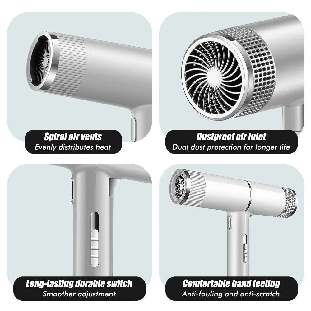 Specification Product material: ABS+PC Motor type: brushed motor Function: negative ions, hot and cold air Temperature regulation: hot and cold Power supply mode: plug in Product power: 2500W Voltage: 110V Temperature: 57°C/135°F Product gears: wind three, temperature two Product size: 20*24.5*4.7cm Product line length: 2 meters Product noise: 45-50dB (including) Application Scenario: Salon, hair salon, barber store, home, dormitory, travel, hotels and other available Advantage: Quick cold air button, hot and cold air switch; Lightweight body, long time use will not be sore hands; Constant temperature does not hurt hair; Double temperature control protection, plus overheating protector Pacakge List: 1 x hair dryer 3 x nozzles 1 x English manual