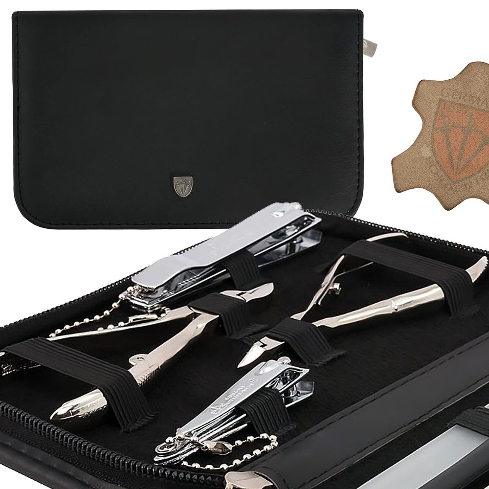 Exclusive 11-Piece MANICURE - PEDICURE - GROOMING ? NAIL CARE set - ?Made in Solingen/Germany? by THREE SWORDS Contents: Cuticle scissors, nail scissors, nail clipper, toe nail clipper, cuticle remover, tweezers, glass nail file (double sided), sapphire nail file, nail nipper, cuticle nipper, double instrument Case: Genuine leather black Size ca. 18,0 x 11,0 x 2,0 cm Delivered in an attractive THREE SWORDS gift box Gift idea Our manicure sets are unique gifts for him and her - suitable for home or travel use Customer Satisfaction Guarantee: Fast and uncomplicated customer service - in case of any questions or problems - please contact us directly . We will always find a solution in the interest of our customers! Product Review: Was a recent product review of another customer helpful for you? Only after having made a product review you are sharing your experience with our product and service with other customers so that we can improve our range constantly. THREE SWORDS - Flexible and innovative manufacturer of manicure and pedicure products. The product range covers everything you need for a perfect nail care and is well known for its high quality of manufacturing and their first class "value for money". "THREE SWORDS - Drei Schwerter" is a traditional "Solingen" company and was founded in 1927 in Germany. NAIL CARE KIT from with professional manicure and pedicure tools. Our sets for home and travel use convince trough highest levels of quality, modern design, durability and German engineering combined with a first class customer service. Cuticle scissors, nail scissors, nail clipper, toe nail clipper, cuticle remover, tweezers, nail cleaner, sapphire nail file (fine and coarse coating), nail nipper, cuticle nipper, glass nail file (double sided). STEEL IMPLEMENTS: Hand made, bright nickel plated (protection against corrosion), polished and hardened. All sets come in an attractive gift box. Instruments are made in Solingen / Germany (except nail clipper). CASE: Genuine leather black, size ca. 18,0 x 11,0 x 2,0 cm. Our organizers are made of high-grade fashion or classic materials. Additional equipment: Microfiber cleaning cloth for cleaning steel items, general info sheet “Finger - Nail Grooming”. SATISFACTION GUARANTEE: Please CONTACT US DIRECTLY, we ALWAYS find a solution! A 3 Swords beauty set is a perfect present for women, woman, girls and men and ideal for XMAS, birthday, mothers / fathers day, marriage, thanksgiving and valentines day!