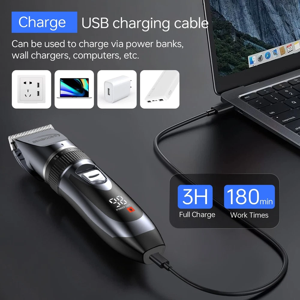 Hair Clippers for Men, Cordless&Corded Hair Clipper, Professional Barber Kit for Hair Cutting & Grooming Set, Mens Hair Clippers with LED Display.The hair clipper is a complete set that includes an electric hair clipper, a shawl, a cleaning brush, a cleaning sponge, 2 scissors, a comb, 4 trimming combs (3MM, 6MM, 9MM, 12MM), 6 trim patterns,a data cable, and an instruction manual.Titanium fixed blade and ceramic movable blade of this hair clipper (moving and standing blades run together), designed for pro precision and premium cutting performance. R-sharped blade, safe and make no harm to the skin. [Professional hair clipper]The hair clipper is a complete set that includes an electric hair clipper, a shawl, a cleaning brush, a cleaning sponge, 2 scissors, a comb, 4 trimming combs (3MM, 6MM, 9MM, 12MM), 6 trim patterns,a data cable, and an instruction manual. [Powerful Rotary Motor] - The powerful rotary motor can keep the stable rapid cutting speed even to meet the thickest hair. Enable you to remove dry /wet hair in one stoke, no more snagging or pulling. Ergonomic handle is fitted to ensure a comfortable and secure grip. [Efficient Safe Hair Cutting] - Titanium fixed blade and ceramic movable blade of this hair clipper (moving and standing blades run together), designed for pro precision and premium cutting performance. R-sharped blade, safe and make no harm to the skin. [Smart LED Display]-The cordless hair clippers for men effortlessly monitor your cordless clipper's performance with the built-in digital display, offering real-time information on the remaining charge, charging status, and lubrication levels. The ultra-high-definition LED display equips you with all the details you need for optimal performance and achieving the perfect haircut [Perfect Gift Choice] The hair clippers with a textured metal shell for a sleek and professional look. It's a perfect gift choice as birthday gift, Christmas gift, or Valentine's Day gift for your loved one