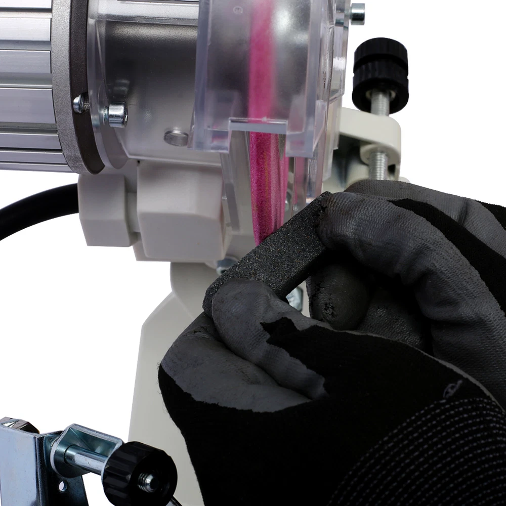 Specification Product Information Product Type: General Item Product Name: Chainsaw Sharpener Professional Multi-Angle Adjustable Chain Grinder 120-Volt Bench Grinder Universal Saw Chain Sharpener, for All Chainsaw Chains gray color Main Color: Gray Main Material: Steel Product Dimensions Assembled Length (in.): 12.60 Assembled Width (in.): 9.80 Assembled Height (in.): 17.70 Weight (lbs.): 13.40 Package Size Length (in.): 14.60 Width (in.): 11.00 Height (in.): 10.20 Weight (lbs.): 16.30 Description Perfect for professionals: This grinder is designed for frequent, high volume chain sharpening, making it an excellent choice for professional users. Save time and money: With this versatile grinder, you can sharpen your own chainsaw chains right in your workshop or garage, saving you time and money. Universal sharpener: Sharpen almost any saw chain, including those from manufacturers like Oregon, Stihl, Husqvarna, and more, with the ability to sharpen up to .404" pitch chains. Accurate sharpening: The Grinder features multiple adjustment points for precision sharpening, and a built-in light that provides better visibility while you work. Complete kit: Included in the box are the Grinder, a dressing brick and profile guide, operator instructions, plus two grinding wheels (3.2mm & 4.7mm) and a 6.0mm flat profile disc for depth gauge maintenance.