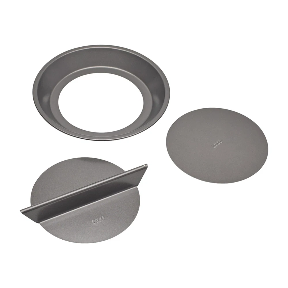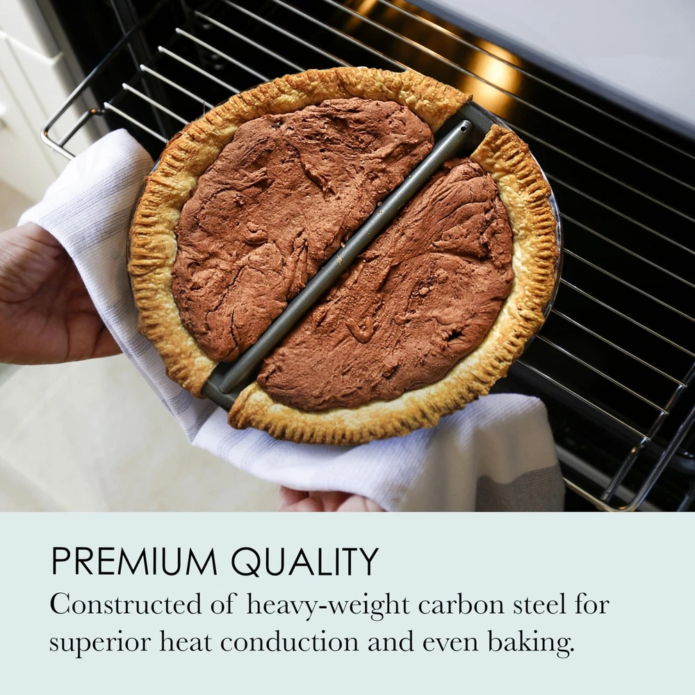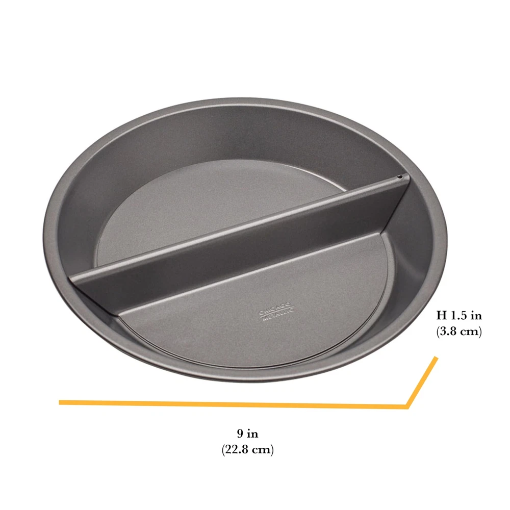 Did you ever want to bake different types of pies to give your guests options, but making whole pies would leave you with too much leftover dessert? That’s where the Split Decision Pie Pan by comes in to save the day. This versatile pan includes an insert for making either a traditional full size pie, a half pie, or separate half pies simultaneously without the ingredients blending. To satisfy everyone’s palate, from savory to sweet, simply place the convenient divider into the pan, and then create a different pie on each side with its own filling, crust, and topping. For simple removal and serving of either whole or half pies, both the removable divider and bottom of the pan easily lift out and have a silicone-based, nonstick coating for easy release, so your crust won’t be damaged in the process and cleanup is a breeze. Pan is made from heavy-weight carbon steel for superior heat conduction and even baking. Avoid using sharp-edged utensils and knives against the surface. Oven safe to 450°F / 232°C; not intended to be used under the broiler. Full pan measures 9 inches in diameter by 1-1/2 inches high. Hand-wash only to extend the product life. . CHOOSE-A-SIZE PIE PAN: this versatile pan allows you to create either a traditional full-sized pie, 1 half pie, or 2 halves with the use of a divider insert that keeps the halves from touching CONVENIENT DESIGN: this traditional shaped pie pan measures 9 inches in diameter by 1-1/2 inches high with a lift and serve, detachable bottom that enables easy removal without damaging the crust SUPERIOR RESULTS: constructed of heavy-weight carbon steel for superior heat conduction and even baking NONSTICK COATING: pan features a silicone-based, nonstick coating for easy release and simple cleanup, and is heat safe up to 450º F (232º C) EASY CARE: hand-wash only to extend the product life