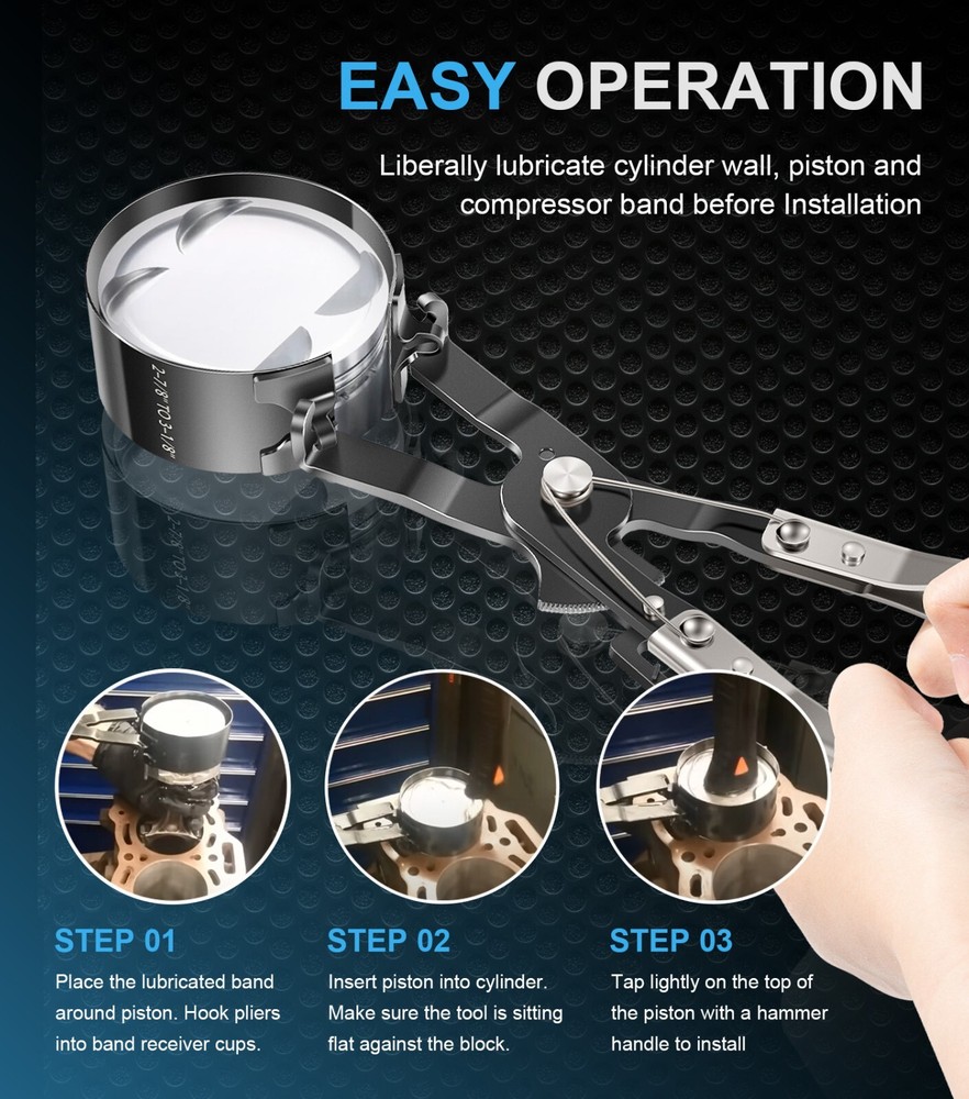 This piston ring compressor set is a game-changer for engine work! The heavy-duty pliers make installation smooth, and the labeled rings fit a wide range of engines—perfect for cars and trucks. The sturdy case keeps everything organized, and the ratchet action provides great leverage. No more struggling with rings—this set makes the job quick and easy. Highly recommended for DIYers and pros alike!