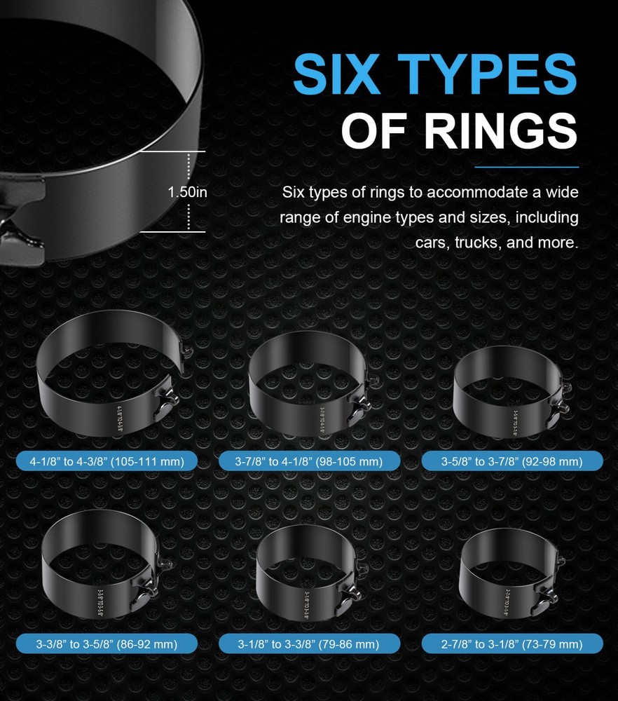 Piston Ring Compressor Tool Set 940387 Used for Car Engine, Vehicle Maintenance Clamps, Ratchet Pliers, Storage Case, Piston Size Coverage from 2-7/8" to 4-3/8" 【Wide Application】 This set is specially designed for the installation of pistons into a wide size range of cylinders. The 6 piston rings come in a range of sizes with label for easy identification, compatible with a wide range of engine types and sizes, including cars, trucks, and more. 【Features】 This heavy duty plier offers strength and leverage for easy band compression. Features a ratchet locking mechanism to securely resists circumferential tension and reduce hand fatigue, which allows you to compress or expand the ring through gradual moves and lock at a desired size without continued pressure on the handles. 【Material】 The kit is forged from high quality steel with black coated for rust and corrosion resistance. Piston rings are made to withstand the rigorous demands of engine operation, and handles adopt ergonomic design to provide a comfortable grip. Instructions are included in the package for easy installation. 【Package Contents】 This kit include a plier and 6 different bands to accommodate varying piston sizes: 2-7/8” to 3-1/8” (73-79 mm), 3-1/8” to 3-3/8” (79-86 mm), 3-3/8” to 3-5/8” (86-92 mm), 3-5/8” to 3-7/8” (92-98 mm), 3-7/8” to 4-1/8” (98-105 mm), 4-1/8” to 4-3/8” (105-111 mm). Also includes a storage case for easy carry and an instruction for easy usage. CONTACT US: If you meet any problem after receiving our product, please feel free to contact us. We will try our best to solve your problem. SHIPPING POLICY: Orders will be ship out within 1-2 business days after payment has cleared. Orders from Saturdays, Sundays or holidays will process on next business day and will be ship within 24 hours. Please allow 10-30 days for international deliveries. Some shipments could take longer subject to your local customs authorities. RETURE & WARRANTY: 1 We accept 30 days return guarantee for all Items If you are unsatisfied with something you bought from us, you may send it back within 30 days of receipt, and we shall be happy to exchange or refund. 2 Leave a message note in returned box quoting your item(s) ID and buyer ID. 3 All returned products must be in their original condition and packaging. Unfortunately, if products have been assembled or modified, we cannot take them as returns. 4 It is important that we know when your return is expected. Please save your return tracking number or post receipt, and email it to us. We need this in case there are any issues during transit. 5 Refund will only be issued upon our receipt of the returned parcel. Please allow 2 working days for us to process with your return. ABOUT REPLY: If you have any questions, please feel free to email our service specialists 24 Hours a Day, 7 Days a Week, and we will reply you ASAP. If no response within 24 Hours, please check the spam of mail box or kindly re-send it to us. ABOUT FEEDBACK: Please contact us before leaving Netural or Negative feedback if you are not satisfied our service or products. Good communication is helpful for both of us to resolve any problems and issues. We work hard to make sure EVERY CUSTOMER 100% SATISFIED and resolve any problem for you and always leave positive feedback to all our customers. If you are satisfied with our service, please leave FOUR 5-Detailed Selling Rating (DSR). Thanks!