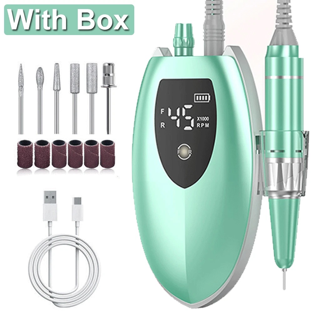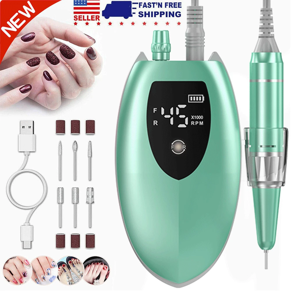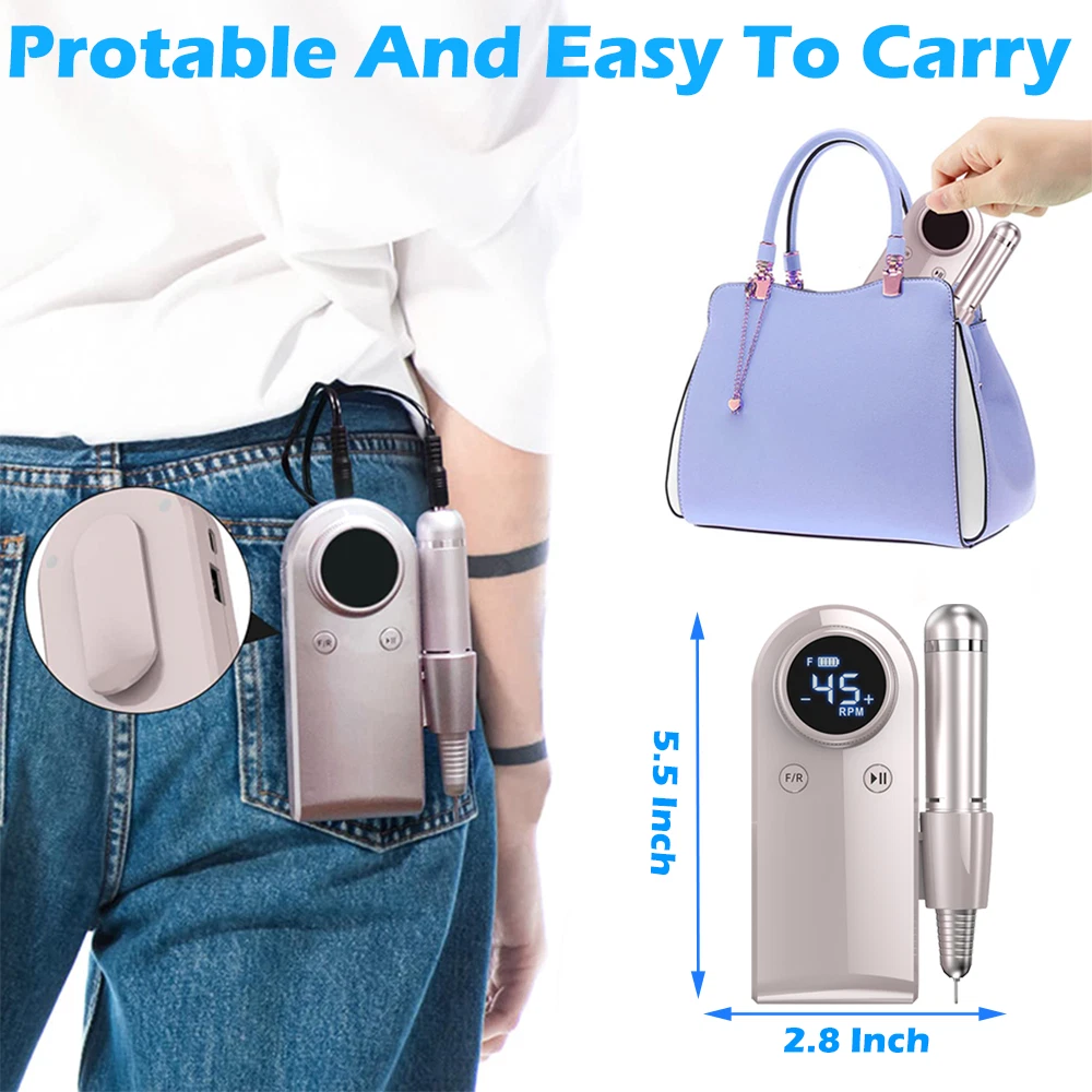 Specifications: ❥Item: Rechargeable 45000 RPM Electric Nail File Nail Gel Polisher Nail Drill Machine ❥Material: Aluminium Alloy+ABS ❥Rechargeable Adaptor Input: 110/220-240V 50~60Hz ❥Speed(RPM): 0~45000RPM ❥Battery Capacity: 4000mA ❥Power: 35W Nail Drill ❥Charging Time: 40 Mins ❥Use Time: 8 H ❥Charging Port: USB Recharge ❥Grinder Type : Suitable for 3/32 "drill bits ❥Grinding Head: 6 types of grinding heads ❥Product Size: 5.6 x 4 x 9.5 Inch( Include Line) ❥Item Weight: Approx 480g Package Includes : 1 x Portable Nail Drill Machine 1 x Handpiece 1 x USB Charger 6 x Drill Bits 6 x Sanding bands 1 x User Manual Feature : ❥❥Powerful and adjustable speed/direction, 6 different metal drill bits, high speed up to 45000 RPM.Low heat, low noise, ultra-low vibration.Powerful smoothing for natural acrylic nails, gel polish dip powder nails, and exfoliation of dead skin and calluses. Professional home and salon use, carving, carving, routing, grinding, sanding, sanding, cutting, polishing, drilling, great for nail polish. ❥❥High-definition LCD display, long battery life & power bank, large-capacity battery with brush less motor, prolonging more use time, this electronic nail machine can last for 8 hours after being fully charged for 40 min . Once charged, you can also use it as a power bank when your phone needs to be turned off. The high-definition LCD display on the rig shows the speed and remaining battery power, which is convenient for you to adjust the speed and reminds you to charge. ❥❥Portable and lightweight design, you can easily take it in your bag. The rig comes with a hook so you can hang it on your clothing, or put it in your pocket or bag. The rig also has a pen holder for easy working in different environments. ❥❥All-aluminum pen, easy to use, high-quality aluminum alloy long-life handle design, matte design can avoid all fingerprints, low noise, low vibration, low temperature operation, safe and reliable.Can be switched left or right, right or left handed. Variable speed control, suitable for different use requirements. Improved wireless smooth operation handle with flexible extension. Rotary lock blocks are used to secure the bit and quickly release the bit. ❥❥The multi-functional manicure drill kit has a wide range of uses, DIY family salon gifts, convenient and elegant gift packaging, and stores various accessories. This is an excellent choice that you must have. Great for holiday gifts. Both professionals and amateurs.