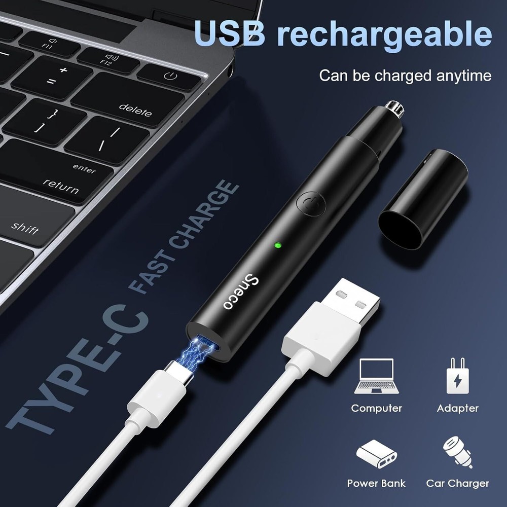 Rechargeable Ear & Nose Hair Trimmer - Professional Painless Facial & Eyebrow Trimmer for Men & Women (Black) 【Powerful Motor & Painless Hair Removal】 The nose hair trimmer boasts an impressive 8500 RPM high-speed motor, ensuring efficient and effortless hair removal. Its metal drive shaft conveys robust power to the cutting head, enabling the double-edged blades to smoothly and continuously trim nose hair. Enjoy a pain-free grooming experience with this trimmer. 【Multi-Purpose Trimmer for Multiple Scenes】 Utilize high-strength stainless steel blades for accurate trimming. Remove the nose, ear, eyebrow, beard, and face excess hair comfortably and efficiently. Sensitive one-touch control and portable design allow you to trim unwanted hair during travels, showing your confidence in any situation. 【Rechargeable Battery】 Long Standby Time. Charge the nose hair trimmer using the included USB C charging cable. Charge on the go, connecting the cable to a USB port, power bank, computer, or USB car charger. One charge powers the nose hair trimmer for up to 6 months. 【IPX7 Waterproof & Easy Cleansing】It’s waterproof and washable, making it easy to deal with residual by soak cleaning or having it take a shower. Washable and removable trimmer head is convenient for cleaning and maintenance. User-friendly handy body design comes with a dust-proof cover to protect the trimmer head.