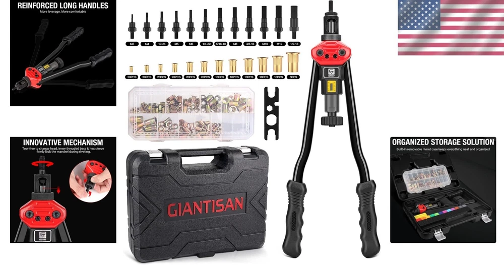 Professional Rivet Nut Tool Kit – 12 Metric & SAE Mandrels, Effort-Saving Design ‹ › ‹ › ‹ › ‹ › ‹ › ‹ › ‹ › ‹ › ‹ › ‹ › ‹ › Professional Rivet Nut Tool Kit Experience the ultimate in riveting efficiency with our Professional Rivet Nut Tool Kit, featuring 12 Metric & SAE Mandrels and an innovative effort-saving design that transforms your projects with precision and ease. Key Features: Innovative Mechanism: Toolless operation for effortless head changes; the inner threaded base & hex sleeve securely locks the mandrel during riveting. Strong and Durable: Crafted from thick carbon steel with heat-treated components, and black phosphating finishing for corrosion resistance. Robust Design: U cross-section of arm ensures high reliability, preventing bending even under stress; designed for long-life performance. Versatile Applications: Ideal for metal plate work, bicycle and car attachments, and various riveting projects. Organized Storage: Complete with 12 interchangeable mandrels (M3, M4, M5, M6, M8, M10, M12, 10-24, 1/4-20, 3/8-16, 5/16-18, 1/2-13), 176 rivnuts, a spanner, detailed user manual, and rugged carrying case to keep everything neat and accessible. Why Choose Our Rivet Nut Tool Kit? Revolutionize your riveting experience with our Professional Rivet Nut Tool Kit. Engineered for professionals and enthusiasts alike, it incorporates cutting-edge design concepts that combine simplicity, comfort, and superior performance. The 16" design enables you to save up to 50% more effort compared to standard tools, allowing for a smoother workflow. Backed by premium service and customer support, we are committed to your satisfaction, ensuring you have everything you need to conquer any riveting task. Join the Giants of Artisanship At GIANTISAN, we believe in equipping you with the right tools to elevate your craftsmanship. Step into the world of professional riveting with our unrivaled tool kit today! Shipping Free & Fast Shipping - We offer free shipping to most of the USA with a normal delivery time of 3-7 days. However, due to the current situation, additional delivery time (up to 3 weeks) may be required for some items. Alternative Carriers - We may use alternative carriers (e.g. USPS, FedEx, UPS, etc.) to ensure your package arrives safely and on time. Due to the use of multiple carriers, we are unable to provide a tracking number automatically. Handling Time - Orders are processed and shipped within 1-2 business days of receiving cleared payment. Shipping Restrictions - Shipping to Alaska, Hawaii, Puerto Rico, Guam, and other US territories may incur shipping charges or delivery restrictions. Please contact us before ordering, or your order can be refunded/cancelled. State Restrictions - There may be restrictions based on your state of purchase. For example, certain items may not be shipped to California due to state regulations. Contact for Tracking Updates - If you require tracking updates or have any concerns about the delivery of your order, please feel free to contact us, and we will be happy to assist you. Return 30-Day Hassle-Free Returns - We want you to be completely satisfied with your purchase. If you are not, you can return the item within 30 days of receiving it for a full refund or exchange. Easy Return Process - To start a return, simply contact us and we will provide you with a prepaid return shipping label and detailed instructions. Restocking Fee - There are no restocking fees for returns. However, the buyer is responsible for return shipping costs if the return is not due to a seller's error. Refund Processing Time - Refunds will be processed within 5 business days of receiving the returned item in its original condition. Payment We accept all major credit cards, PayPal, and Apple Pay for your convenience. Your payment information is secure and encrypted to ensure a safe and seamless transaction. Please complete your payment within 3 days of purchase to avoid any delays in shipping. Feedback Your feedback is extremely important to us. We strive to provide the best products and customer service possible. If you are satisfied with your purchase, please take a moment to leave us a positive review. If you have any concerns or issues with your order, please contact us before leaving negative feedback. We are committed to resolving any problems and ensuring your satisfaction. Contact Us If you have any questions or concerns, please feel free to reach out to our customer support team. You can contact us through the eBay messaging system. We are available Monday to Friday, 9:00 am to 5:00 pm EST, and we will do our best to respond to your inquiry within 24 hours. Thank you for supporting our small family business! UPC: Not Set Model: Not Set Item Width: Not Set Item Length: Not Set Item Height: Not Set Item Diameter: 16 Item Weight: 9.83 Unit Quantity: 1 Material: Carbon Steel,Plastic,Steel Brand: Unbranded Type: Rivet Nut Tool Number of Pieces: 12 Manufacturer Warranty: Not Set MPN: Not Set Color: Black Country/Region of Manufacture: Not Set Unit Type: lb