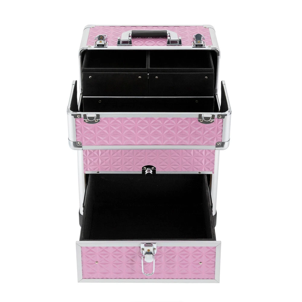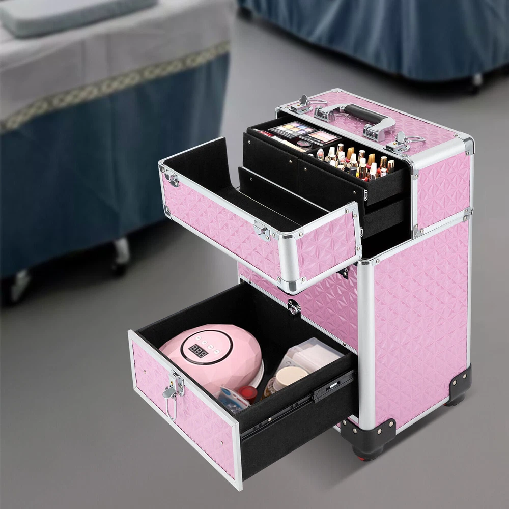 Specifications Material: Aluminum Alloy, ABS, Density Board, and Flannelette Surface Treatment: Indentation Color: Pink Style: Modern Shape: Rectangular Bearing Capacity: About 20kg/44.09lbs Number of Items: 1 Number of Wheels: 4 Gears of Pull Rod: 3 Number of Compartments: 7 Number of Drawers: 1 Net Weight: 5.8kg/12.79lbs Gross Weight: 6.8kg/14.99lbs Product Size: 34*25*47cm/13.4*9.8*18.5inch Package Size: 38*29*54cm/14.96*11.42*21.26inch Length of Pull Rod: About 80cm/31.5inch Package Included 1*Rolling Makeup Train Case 2*Keys Professional Rolling Makeup Train Case Cosmetic Trolley Makeup Storage Organizer Professional Rolling Makeup Train Case Cosmetic Trolley Makeup Storage Organizer Description A good hairstyle and makeup can bring us a new look, but messy tools often affect our work efficiency. Our rolling makeup train case can eliminate your concerns very well. Made of high-quality aluminum alloy, ABS, density board, and flannelette, this case is durable and not easy to rust, so you can use it for a long time and save costs. In addition, the large capacity and compact design can provide convenience for your daily use and carry. With the help of this product, your items can be organized neatly. Key Features Premium Material: This case is made of aluminum alloy, ABS, density board, and flannelette, making the product durable, and not easy to deform and rust, so it can keep beautiful and practical for a long time, and you don't need to replace it frequently. Exquisite Workmanship: The pattern on the surface of the case has gone through the indentation process, which can effectively improve the appearance of the product, play a protective role and extend the service life of the product Large Capacity: The case has seven compartments and a smooth drawer. The reasonable layout allows you to store a variety of items by category, such as skin care products, eye shadows, lipsticks, and makeup brushes. It also facilitates your search. Strong Bearing Capacity: The thickened material and stable structure enable the product to bear a weight of about 20kg/44.09lbs, so you can use it without worrying about being overweight. Adjustable Design: The compartment of the product can be adjusted freely, so you can adjust it according to your own needs and the actual situation of the goods, which is very convenient. Safe and Convenient: The front and top of the case are equipped with an independent safety lock with a built-in lock cylinder, as well as a buckle. With the lock catch, you can carry it safely and conveniently when you go out, and it can guard various items in the box anytime and anywhere. Ready to Use: The product adopts an integrated design, so you can use it directly after receiving the goods, saving you time. Beautiful Appearance: The case is pink with smooth lines, and is full of modern and fashion sense, making the product attractive. This case is not only a practical tool but also a chic accessory to show your unique fashion taste. Compact and Lightweight: The size of this case is 34*25*47cm/13.4*9.8*18.5inch, and its net weight is 5.8kg/12.79lbs, so you can put it in the dresser and the studio at will, and it is also very convenient for you to carry. Easy to Clean: The surface of the product is smooth, and the high-quality material makes the product not easy to accumulate dust. After a period of use, you only need to use a towel for cleaning. Ideal Gift: With a good appearance and a large capacity, you can give it to your friends or family who work in the hair salon or makeup shop to help them store hair tools or other items. Protective Shipping: In order to prevent the product from being damaged and bumped during transportation, we fill the package with anti-collision protection foam to protect your products to the maximum extent possible. Details Removable Universal Wheels: This case is equipped with four detachable wheels which are tightly wrapped with 12mm/0.47inch plastic cement, which allows you to move flexibly with low noise. Practical Handle and Pull Rod: There is a handle on the top of the product and a pull rod fixed by two buckles and with three gears, which provides more convenience for you to move and carry it, and it can also meet the needs of people in different heights . Round Corners: The case adopts thickened alloy anti-collision corners and is fixed with 3 rivets, which are solid and stable, just like the armor to protect the product from collision and fall, and it also can better protect your safety and prevent skin from being scratched. Two Keys: Two high-quality keys are provided in the package of the product, which is convenient for you to open and close the product. Application This rolling makeup train case can be widely used by hair stylists, pet groomers , makeup artists, and so on for storing scissors, makeup, jewelry, combs, and other items. In addition, it is also very suitable for you to store tool s or daily necessities when y ou go out. Specifications Material: Aluminum Alloy, ABS, Density Board, and Flannelette Surface Treatment: Indentation Color: Pink Style: Modern Shape: Rectangular Bearing Capacity: About 20kg/44.09lbs Number of Items: 1 Number of Wheels: 4 Gears of Pull Rod: 3 Number of Compartments: 7 Number of Drawers: 1 Net Weight: 5.8kg/12.79lbs Gross Weight: 6.8kg/14.99lbs Product Size: 34*25*47cm/13.4*9.8*18.5inch Package Size: 38*29*54cm/14.96*11.42*21.26inch Length of Pull Rod: About 80cm/31.5inch Package Included 1*Rolling Makeup Train Case 2*Keys Notes Please remember always lift the case with the top carrying handle when going upstairs. Please note that the four wheels of this product are not equipped with brakes. Please allow the slight color difference caused by the shooting light and 1-3cm error due to manual measurement, and make sure you do not mind before you order. Payment Delivery details Terms of sales About us Contact us Payment We accept ebay payment 。 Fees such as import duties, taxes are not included in the item price